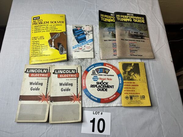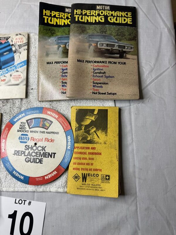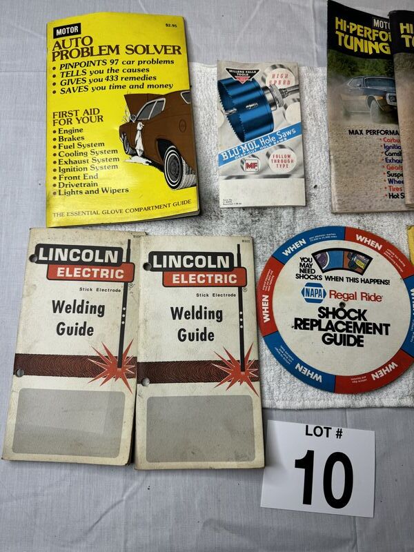 Vintage guidebook advertising lot motor auto problem, solver motor, high-performance, tuning guide, Lincoln, electric welding, guide, Welco application and technical handbook. Blue mole, holesaw, and Napa. Shock replacement guide all creases needs a cleaning sold as is.