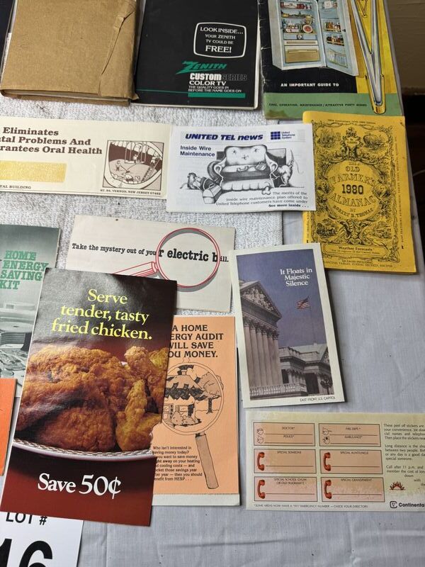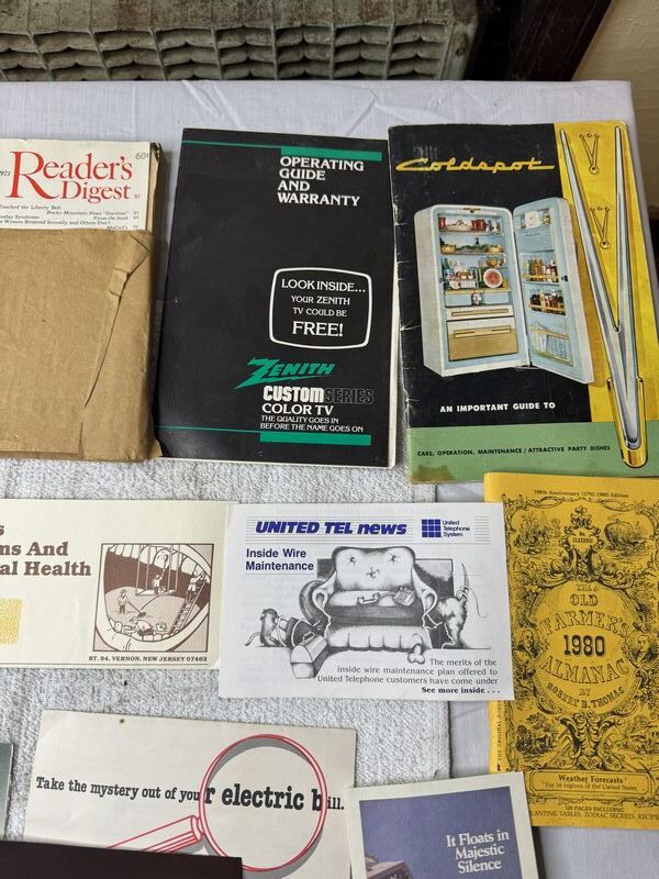 Readers digest, Zenith TV, guide cold spot refrigerator 1980 farmers almanac different brochures of businesses sold as is