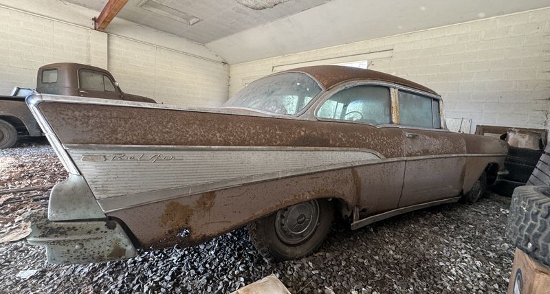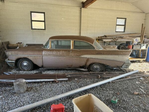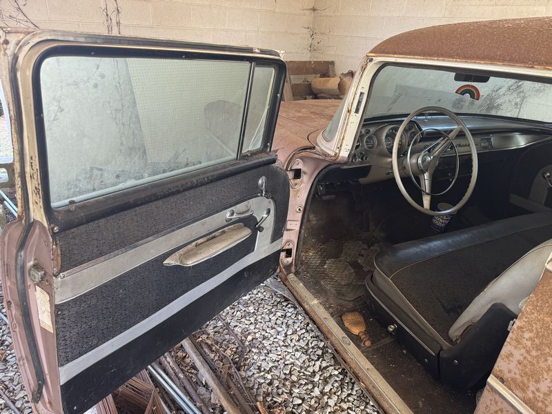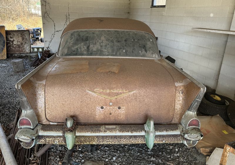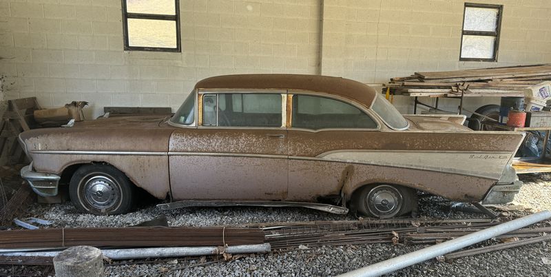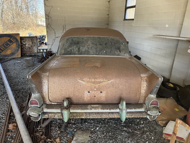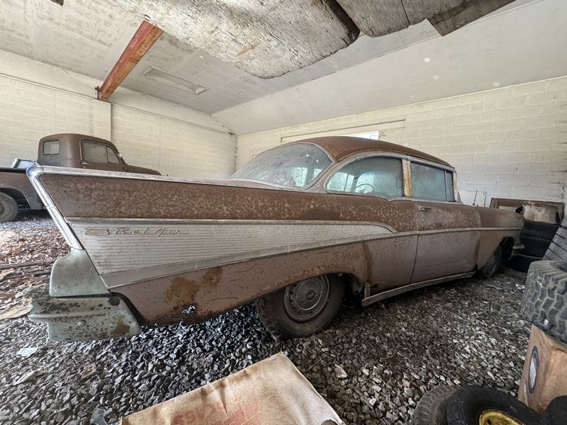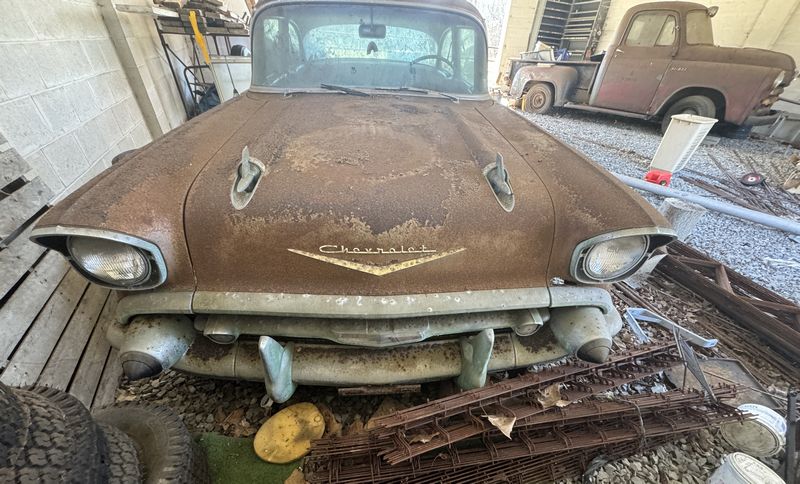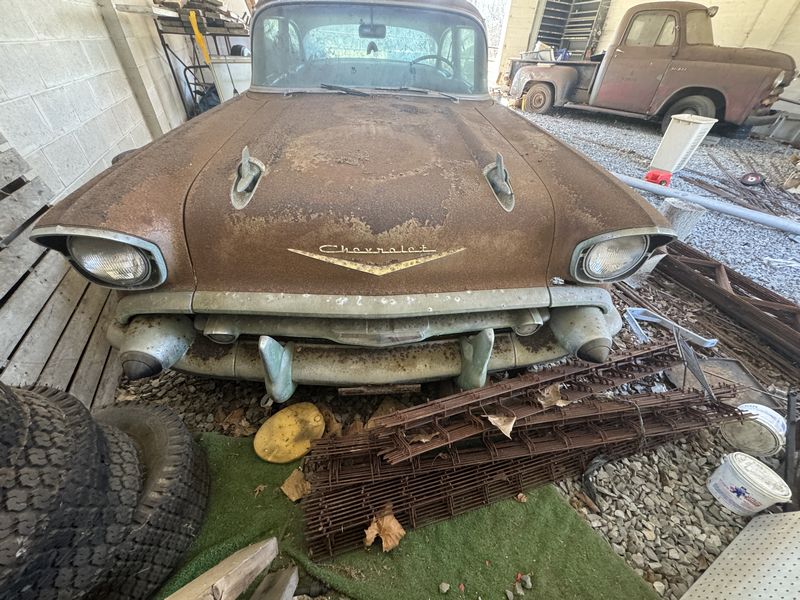 1957 Chevy Belair with title and keys. The car is being sold as a total restoration piece or part car. The car appears to be complete. The motor is missing the carburetor. There’s heavy rust throughout. The interior is in immaculate condition considering its age. See photos for description.