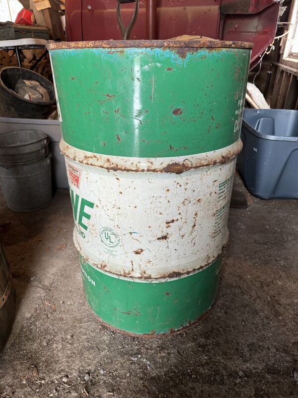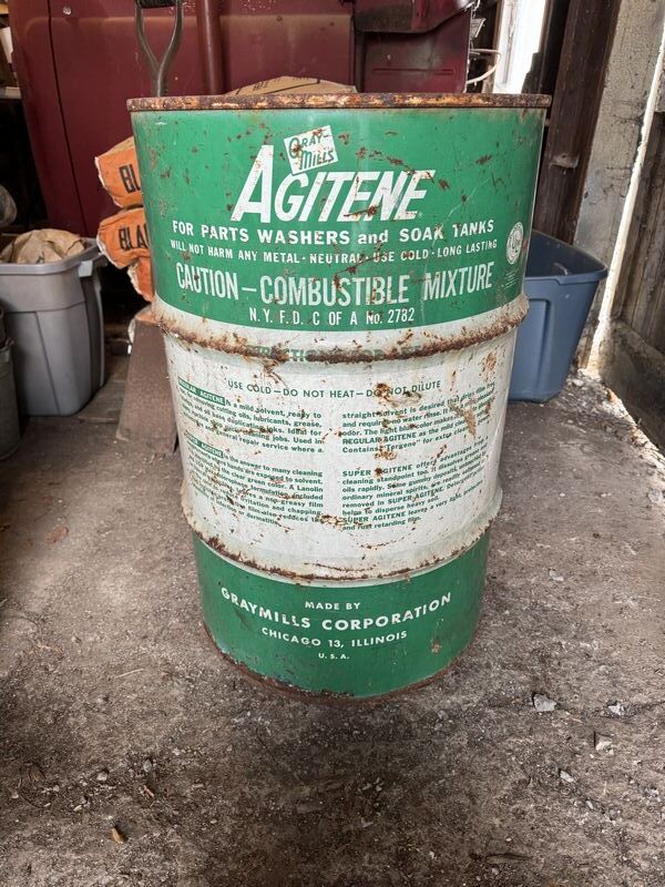 Gray, Mills, Agitene parts cleaning fluid 33 gallon drum. Some rust and tarnish barrel is empty sold as is.