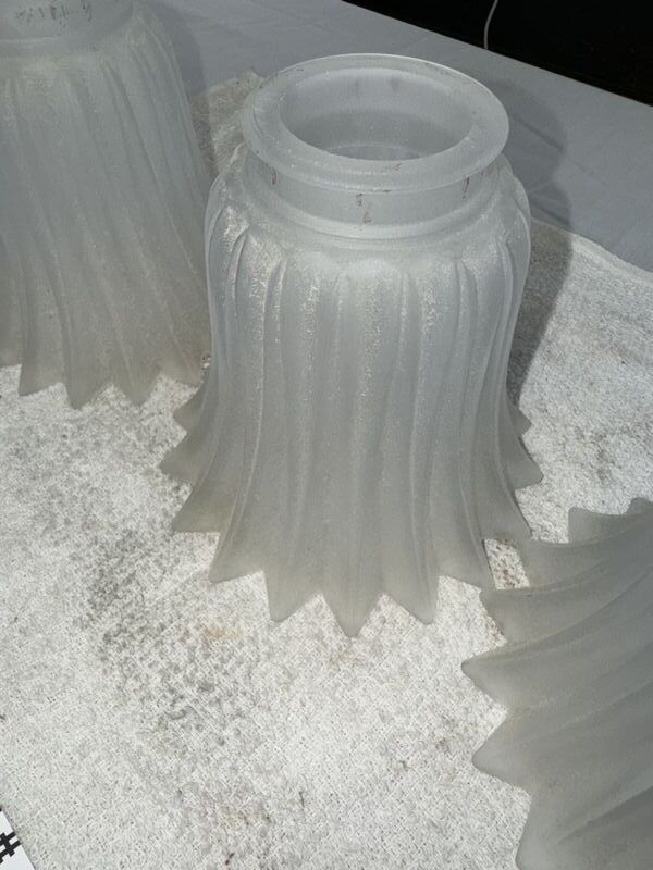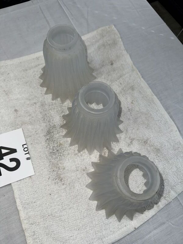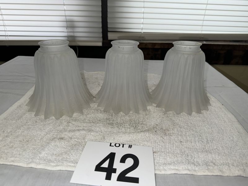 Three frosted lampshades 5 1/2 inches tall and the opening is 2 inches. No chips or cracks sold as is.