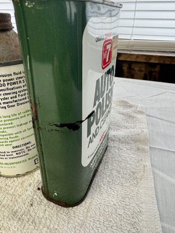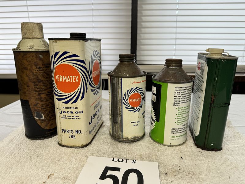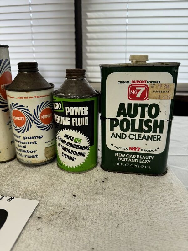 Belkamp ignition battery sealer, Permatex hydraulic jack oil and water pump lubricant, Siloo power, steering fluid and Dupont auto polish. All cans have rust tarnish on them. The Dupont has a hole in it. Some still have liquid inside the cans sold as is.