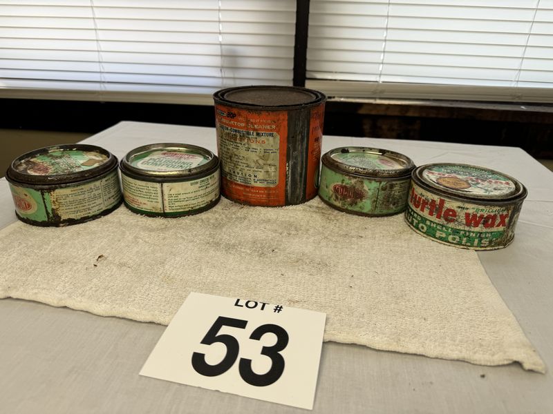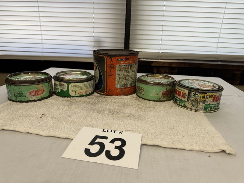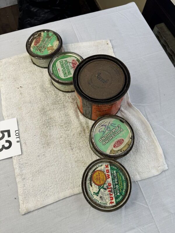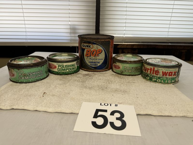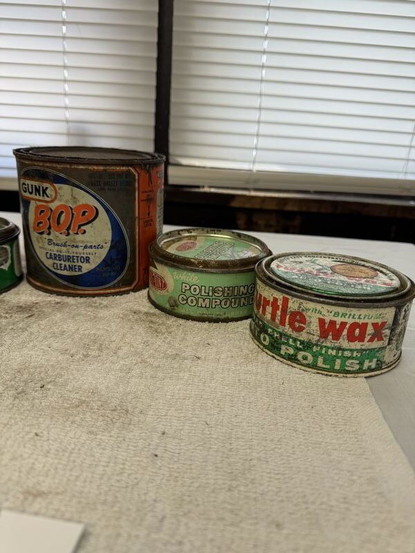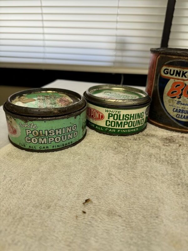 Dupont polishing compound turtle wax auto polish and gunk B. O. P. Carburetor cleaner all cans have tarnish or rust and some of the advertising has faded. See photos for details sold as is.