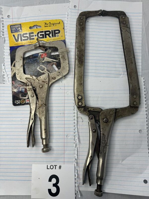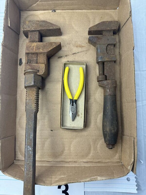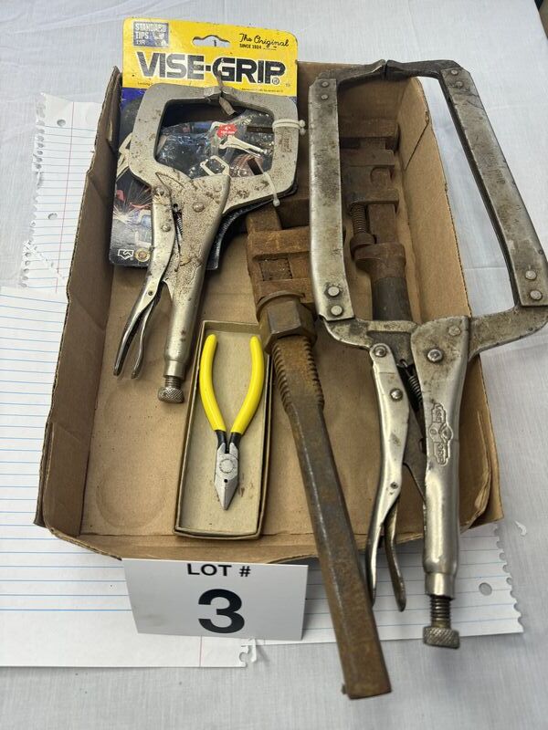 One new old stock, vice grip used vice grip, two antique pipe. Wrenches for restoration. One new old stock, Williams pliers, sold, as is.
