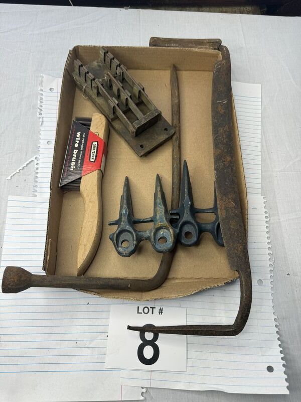 One new old stock, craftsman wire, brush, tractor parts, old electrical, switch, lug wrench, and a wood scraper sold as is
