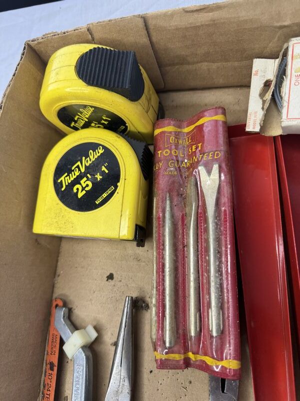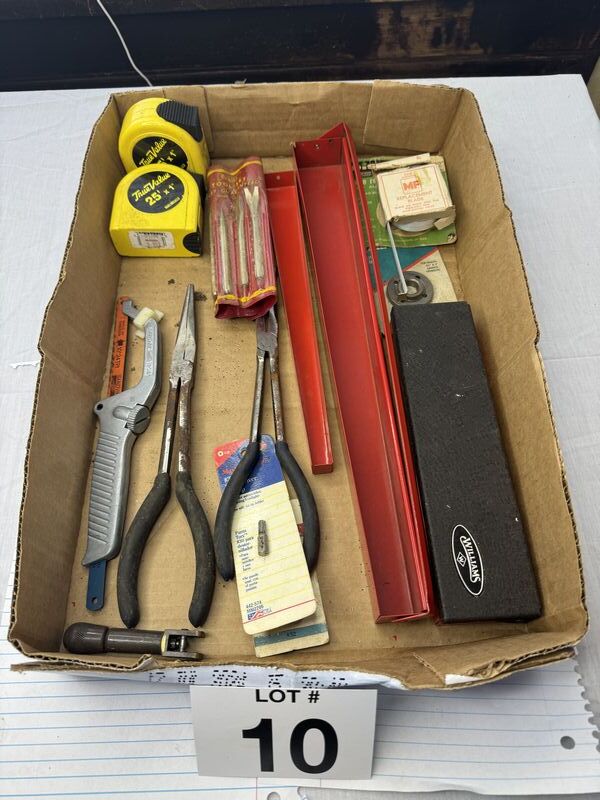 Two socket holders, one Williams socket holder, two new old stock tape measure replacement tape to true value new old stock tape measures saw two pliers some drillbits sold as is