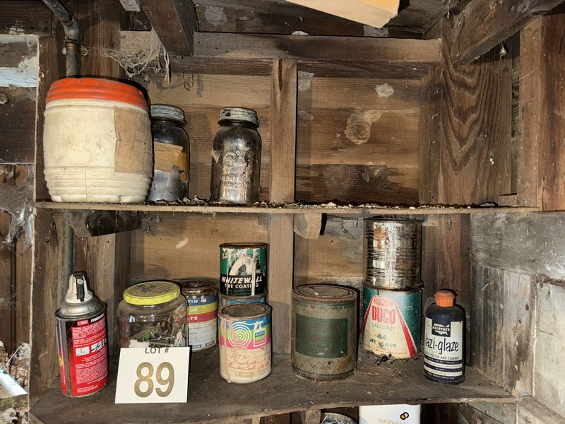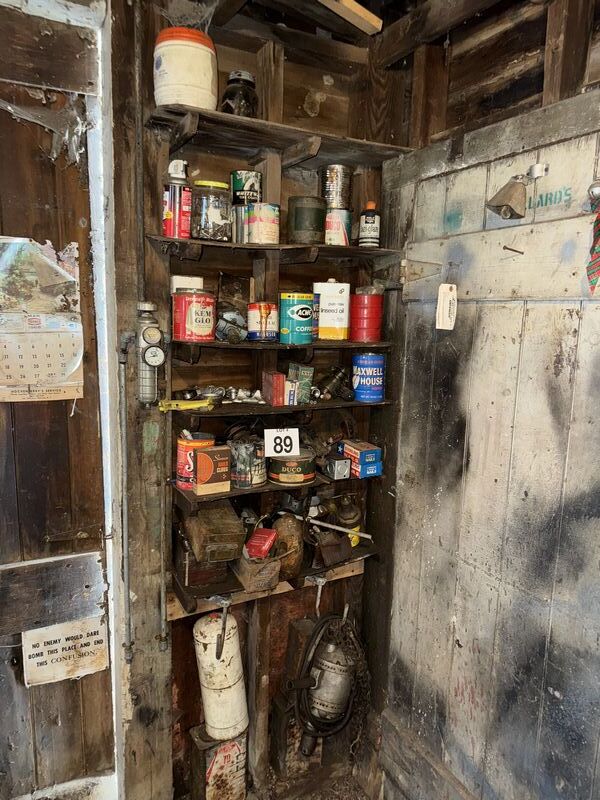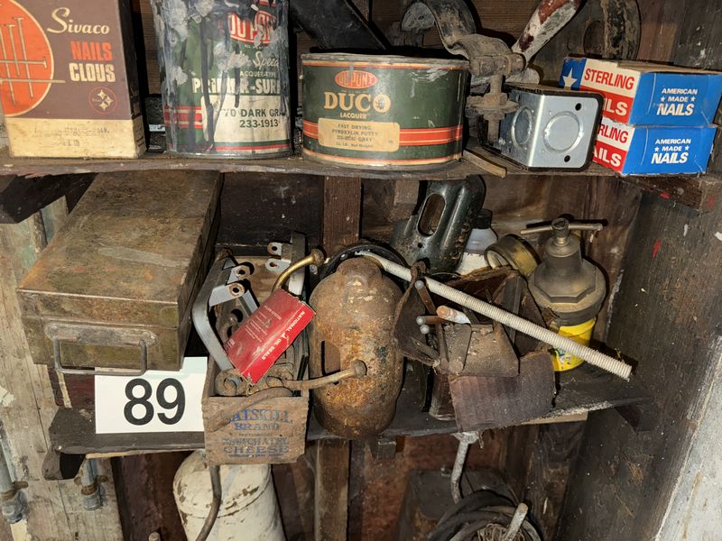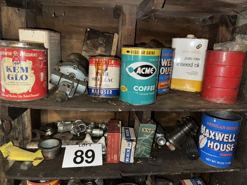 Entire shelf, contents advertising, oil, cans, hardware, drill, everything on or below the shelf sold as is