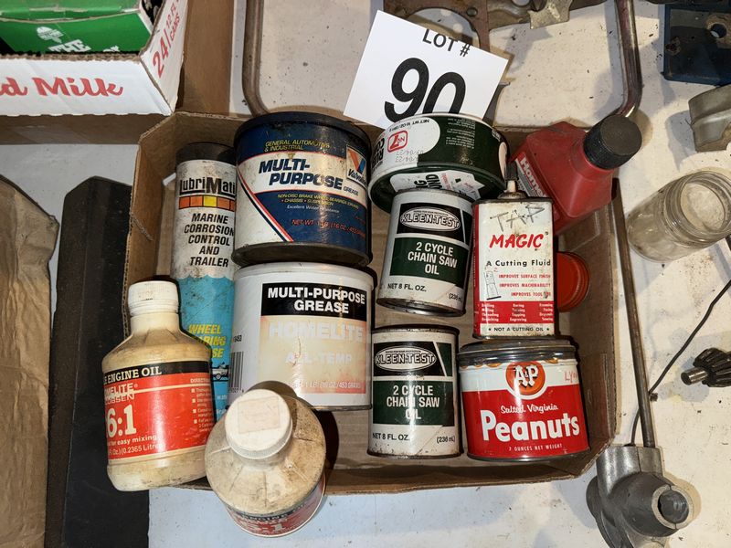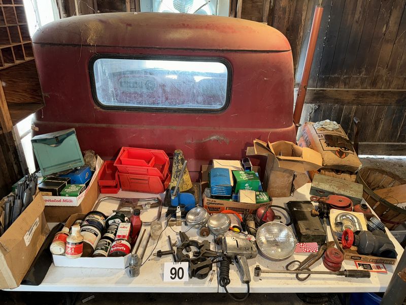 Various items on the table, car parts tools, oil, advertising shelves, hardware, vintage, mailbox 39 Dodge parts all sold as is