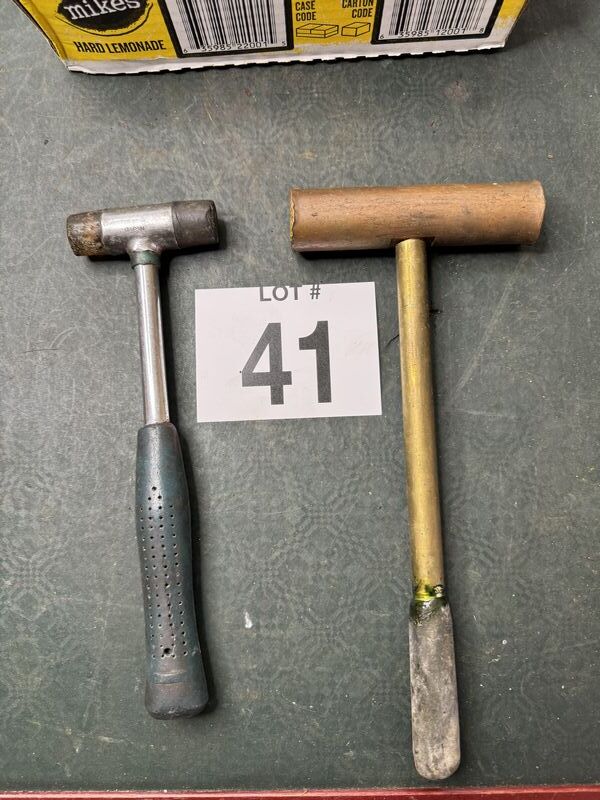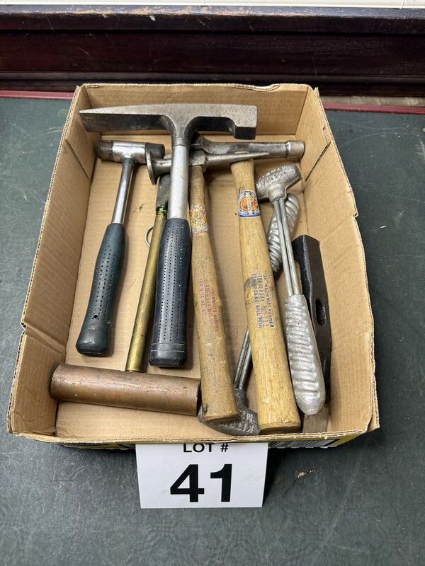2 lead hammers, rubber mallet, copper mallet, 2 machinist hammers, 2 brick hammers. Sold as is.