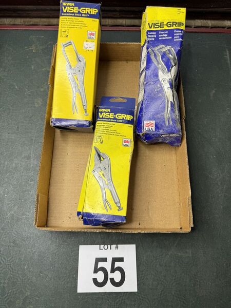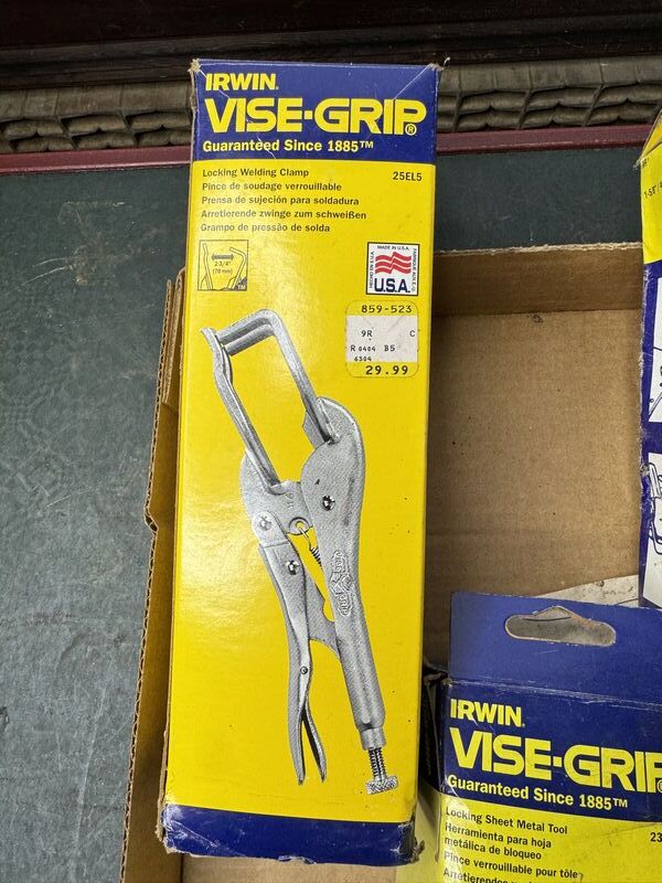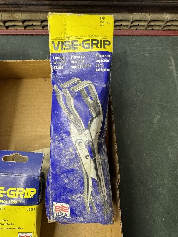 2 locking welding clamps, 1 sheet metal tool. New old stock. Damaged box. Sold as is.
