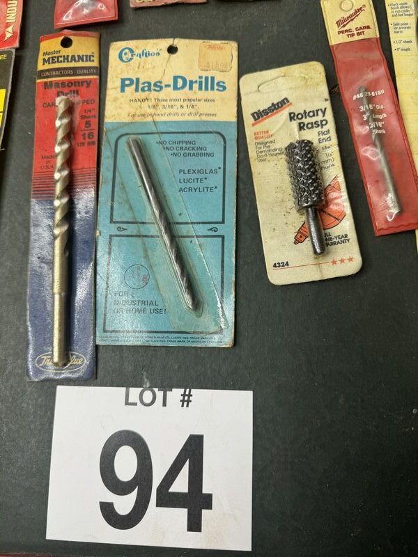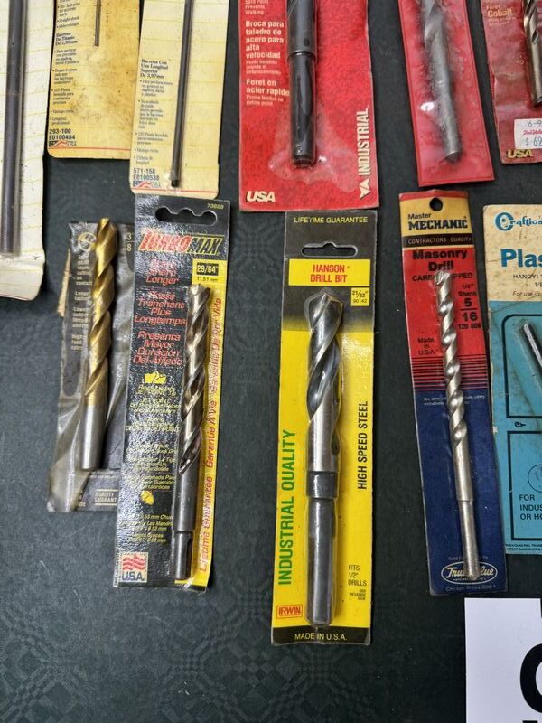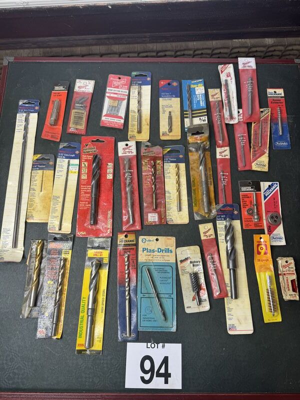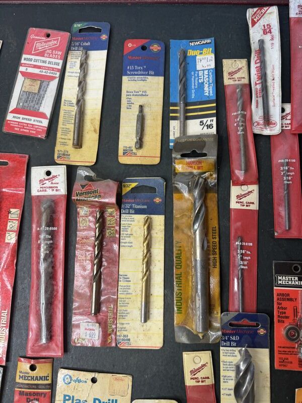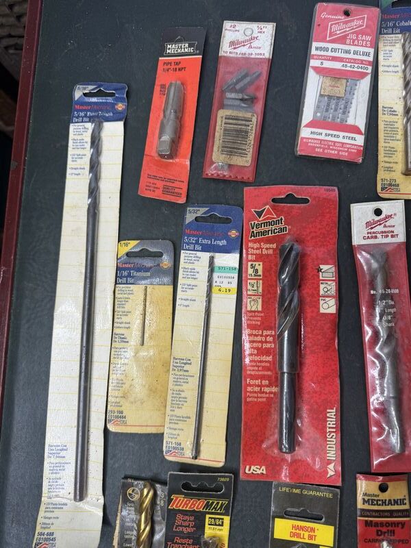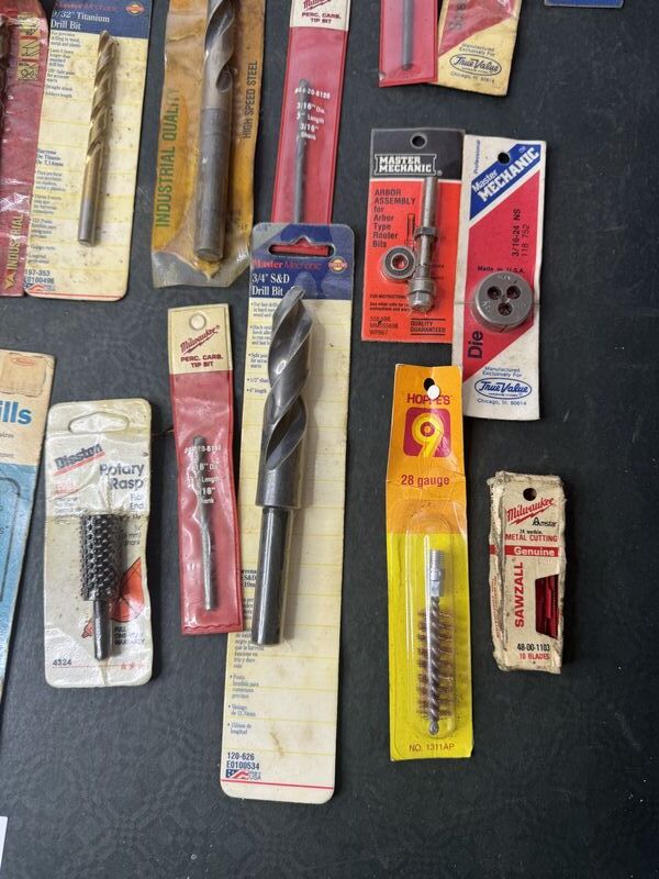 Mostly drill bits, some saw blades and dies. All new unused in package. Sold as is.