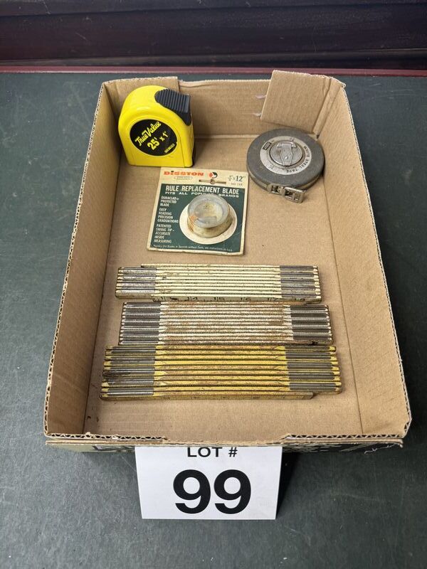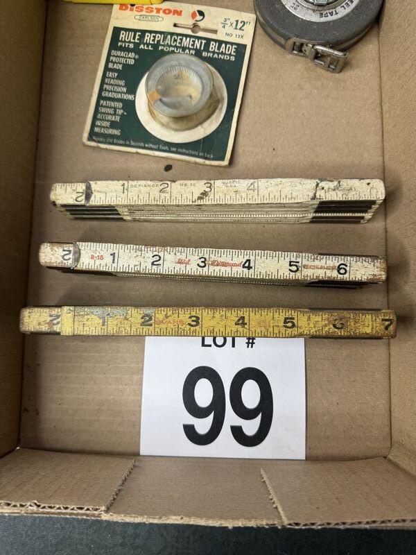 Two tape measures replacement rule and three folding rulers sold as is