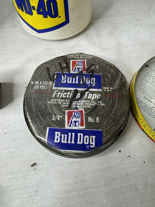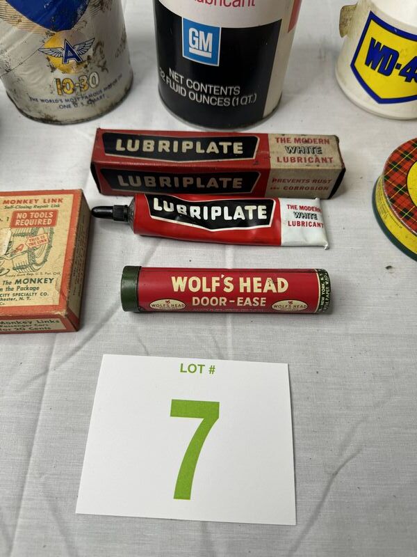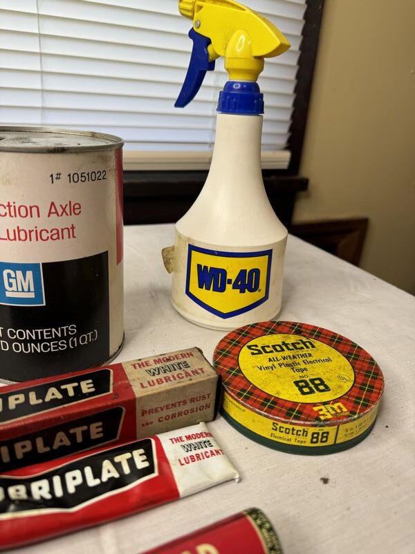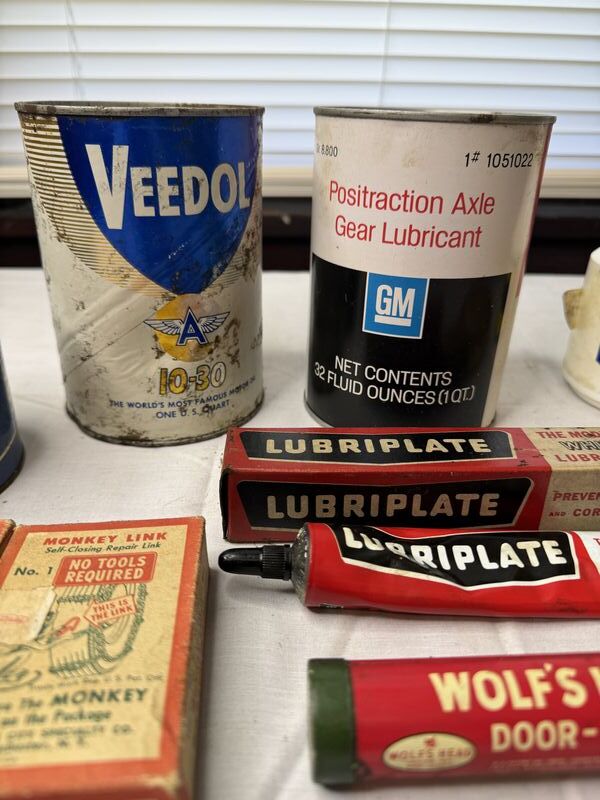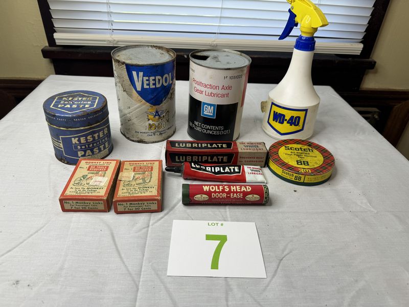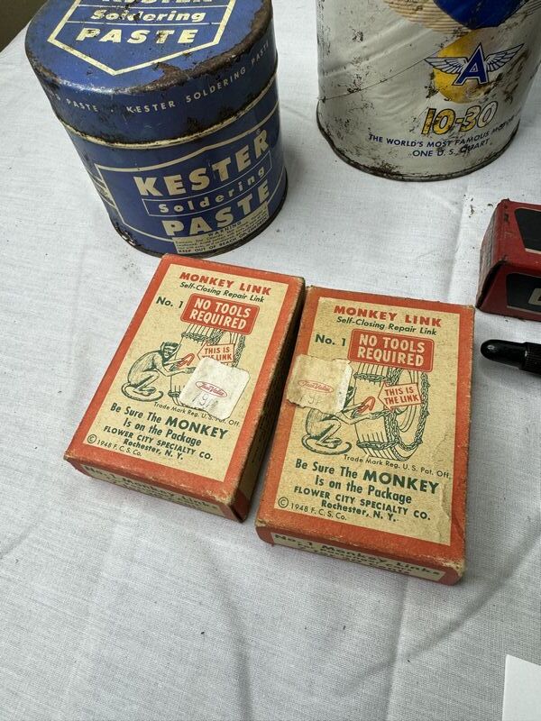 Monkey Link chains new old stock, wolf‘s door ease, scotch electrical, tape, kester paste can, WD-40 bottle, GM gear lubricant with oil, Veedol cardboard can empty with hole on bottom, and Lubriplate. Sold as is