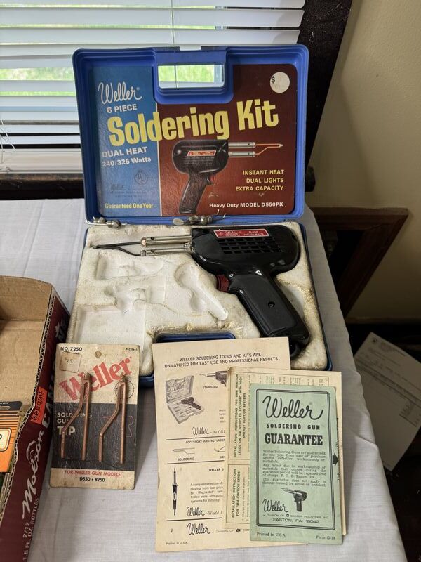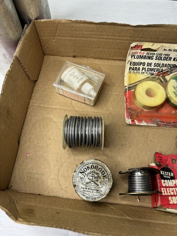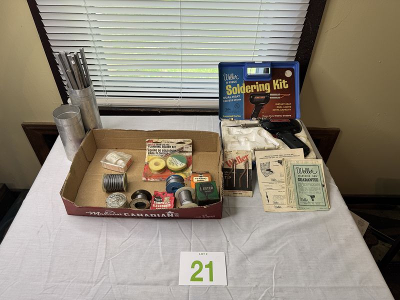 Various soldering tools and soldering gun accessories, lead bars sold as