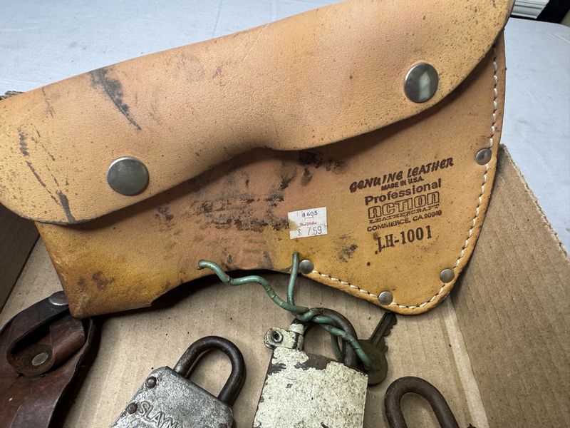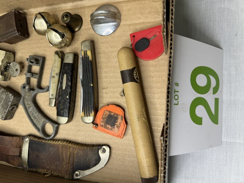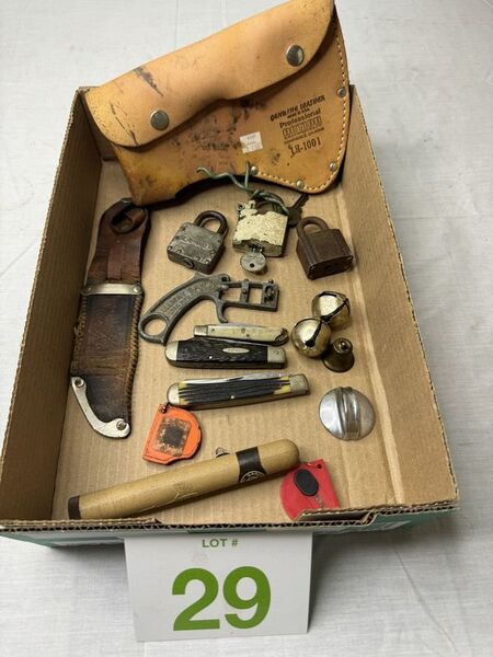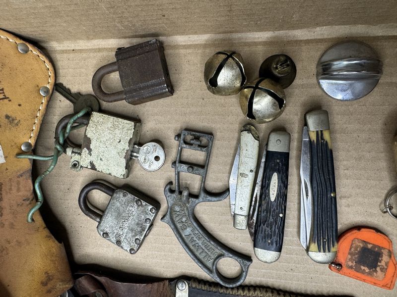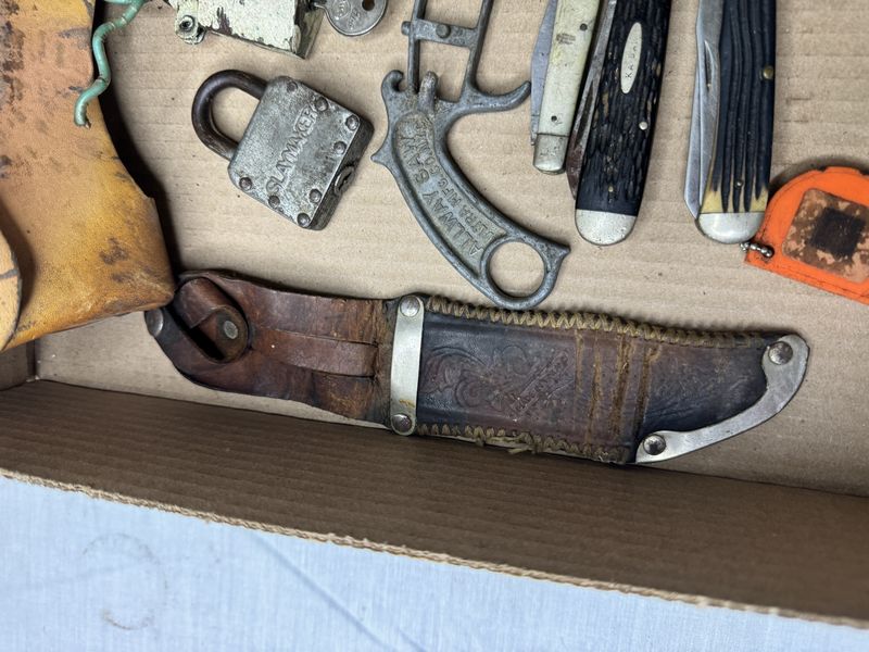 Various knives, sheaths, locks, etc