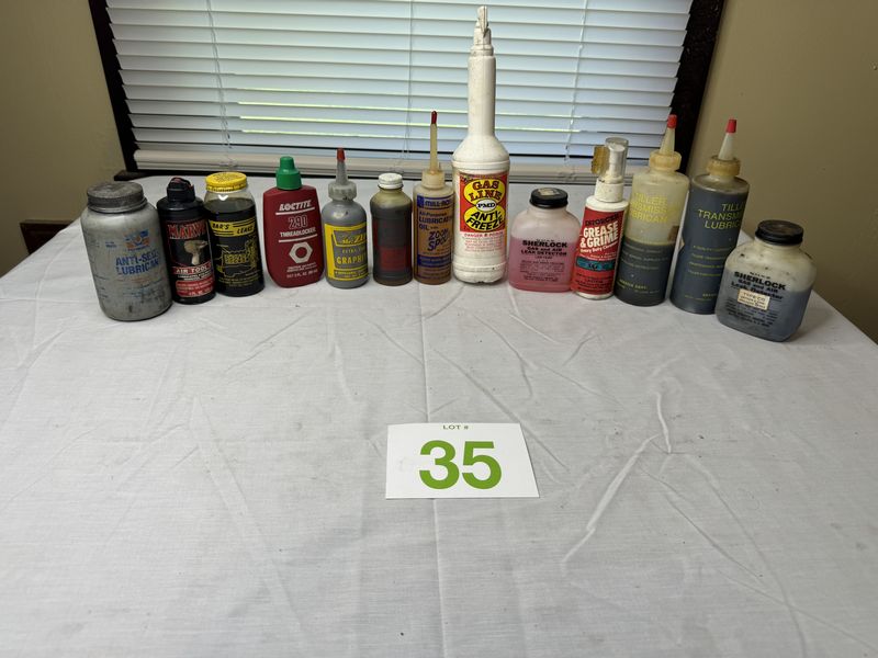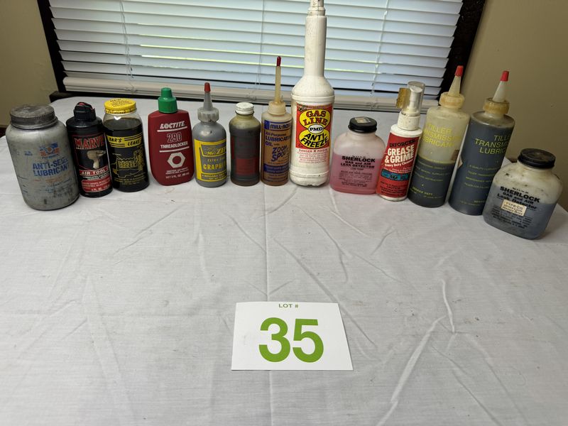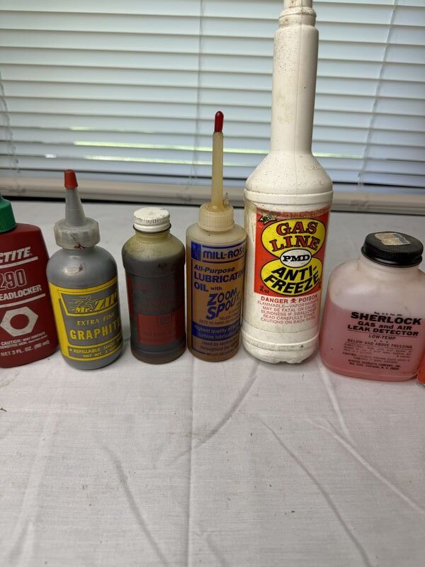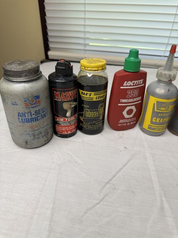 Anti-seize lubricant, marvel, air, tool, lubricants, bar, leaks, thread locker, extra fine graphite, GM lubricant, zoom, spout, lubricant, oil, gas line, antifreeze, Sherlock, gas and air leak detector, grease and grime, heavy duty cleaner and transmission lubricant some used some new old stock sold as is