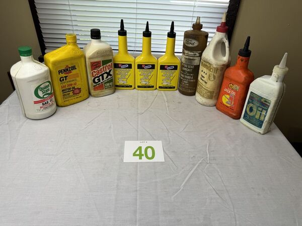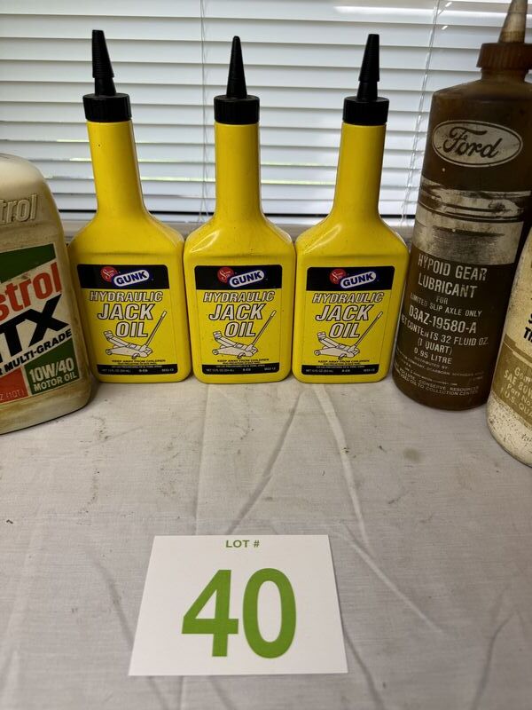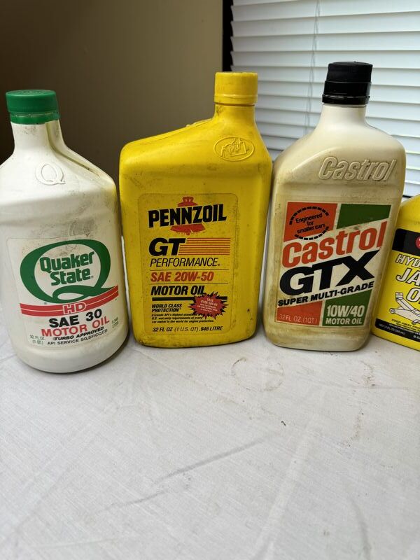Quaker State motor oil used, Pennzoil motor oil unopened, Castrol motor oil unopened, gunk hydraulic jack oil unopened, ford lubricant bottle empty, Kendall lubricant used jack oil used air compressor oil used sold as is