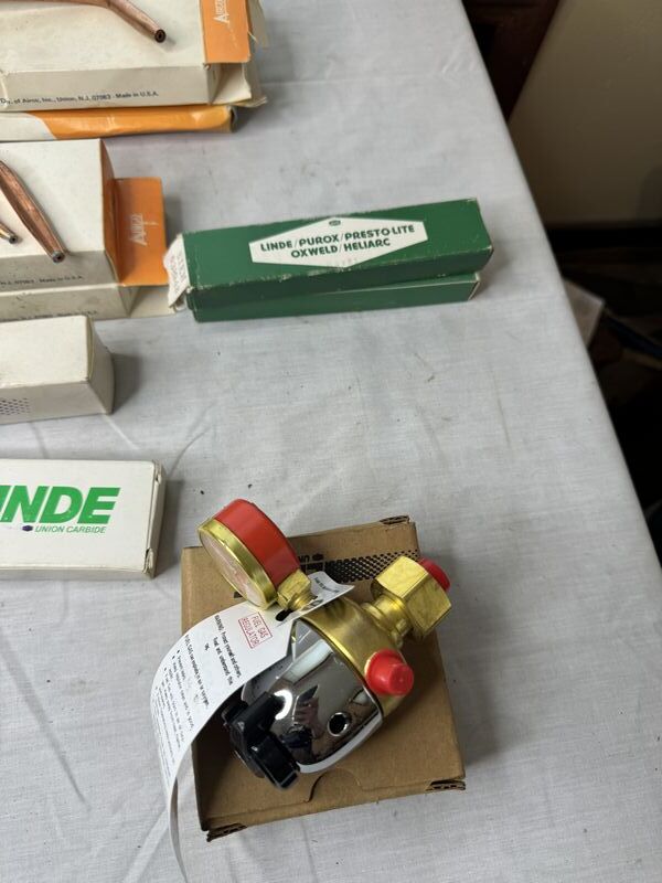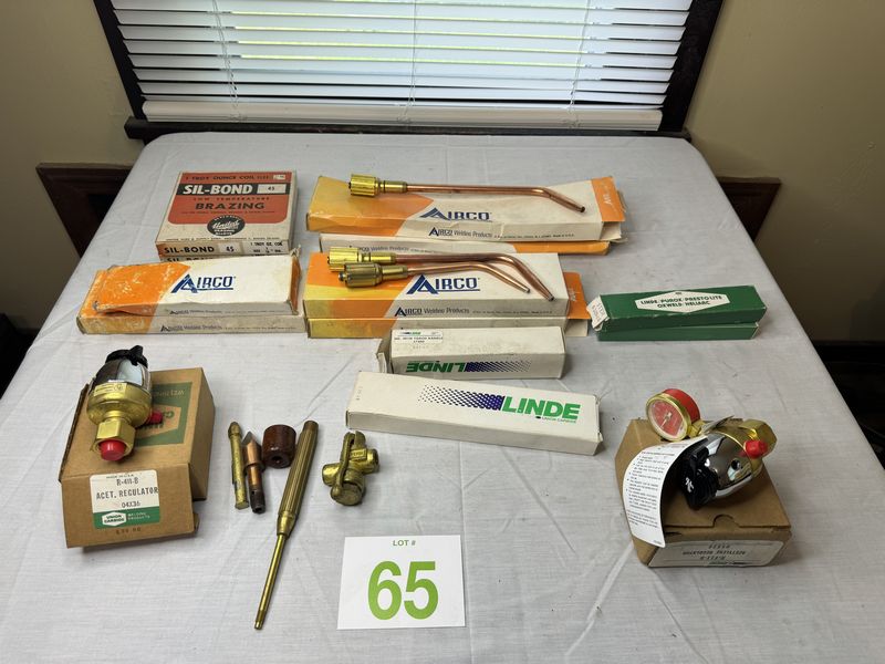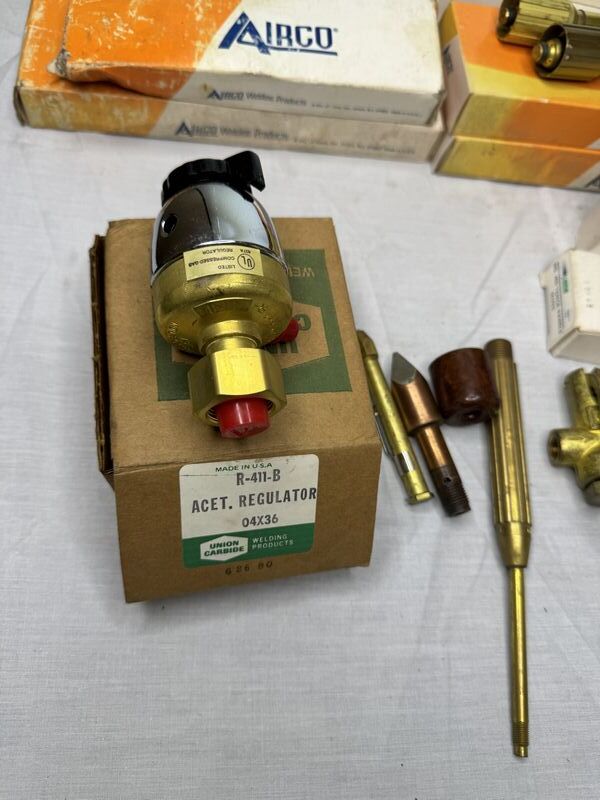 Welding torch tips, handles, and regulators. New old stock. Sold as is