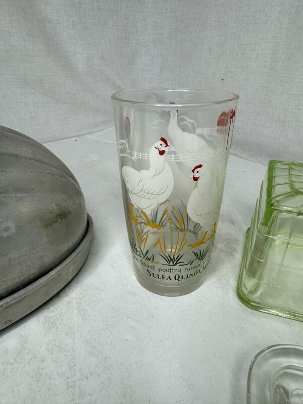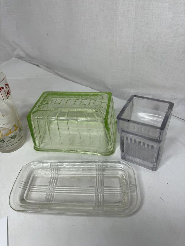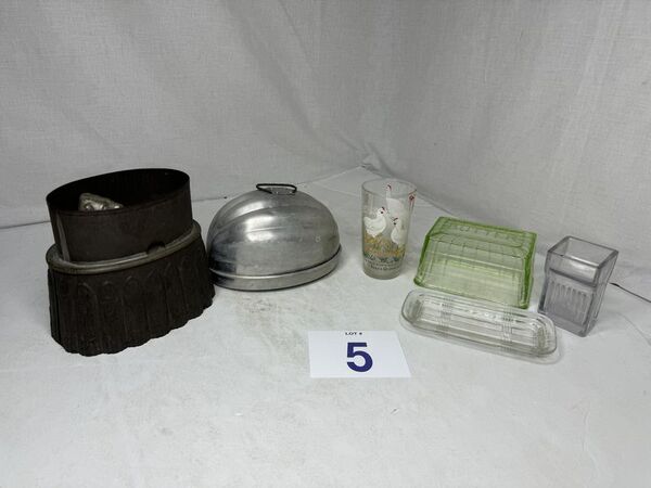 Cake mold, chicken glass, butter dish and lid, no chips or cracks, sold as is