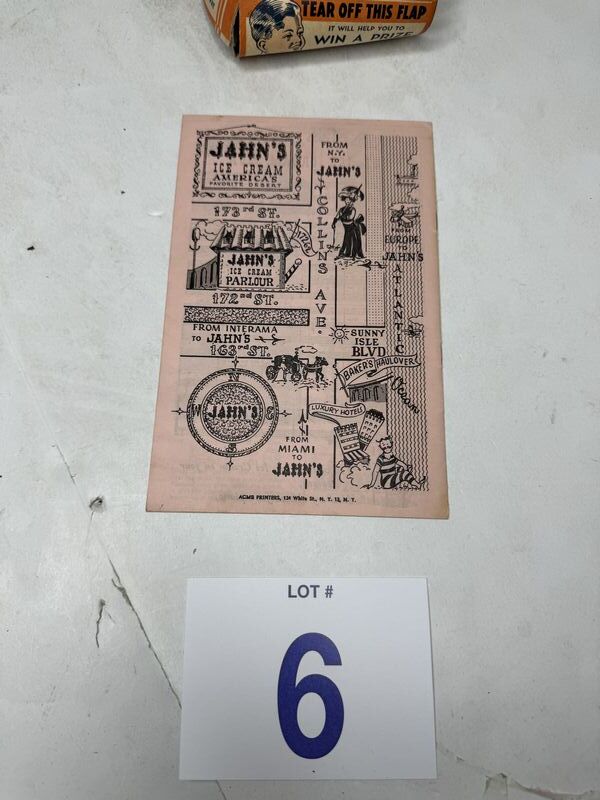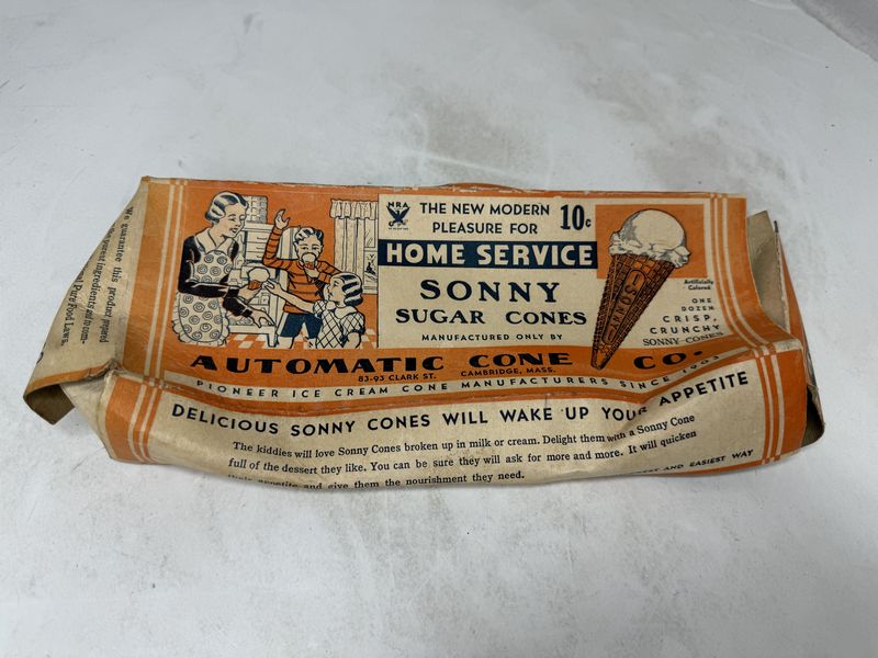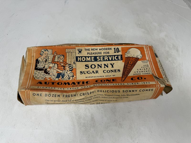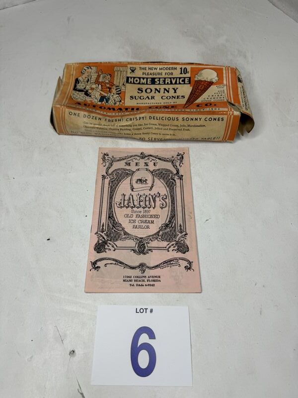 Jahns ice cream parlor menu, and home service sonny sugar cones box, box is heavily damaged. See photos for description sold as is.