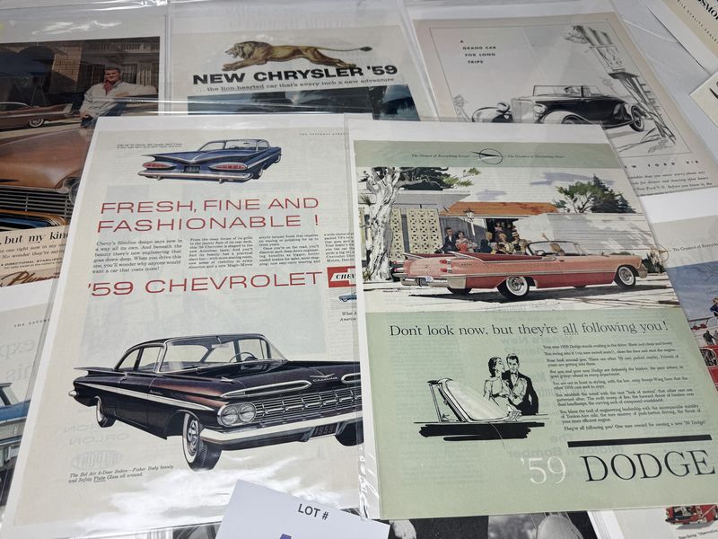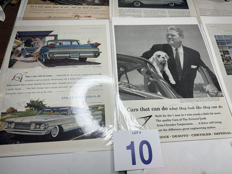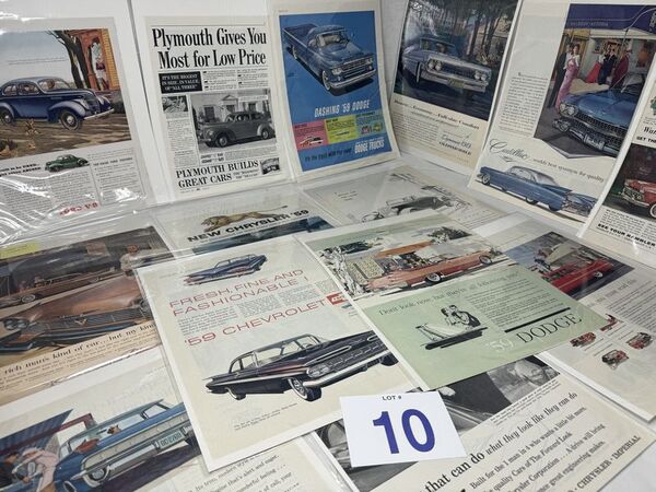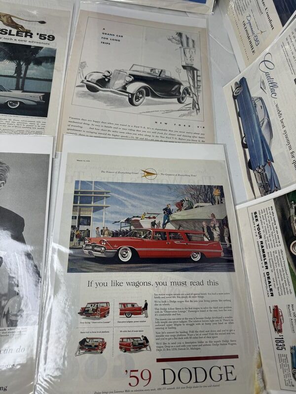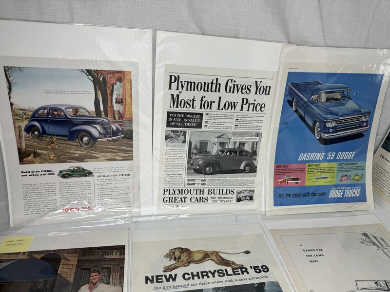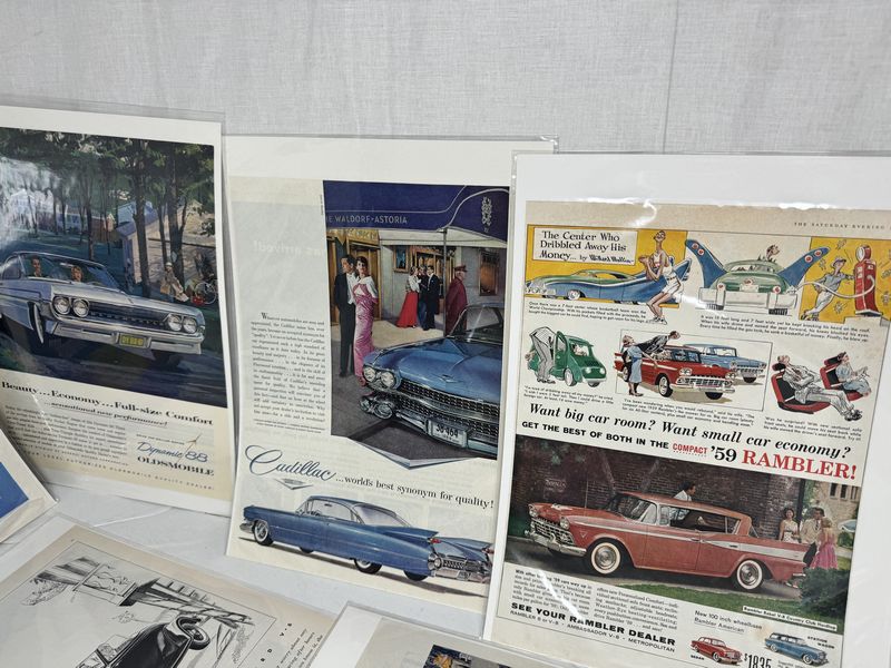 Magazine cut outs. The majority seem to be from the Saturday evening post there are 14 total print pads all in a sleeve with a cardboard backing. See photos for description sold as is.