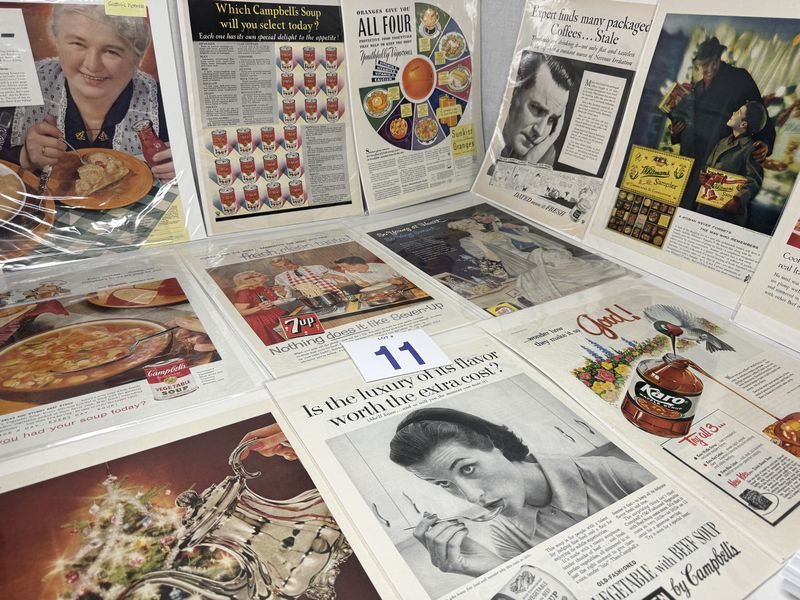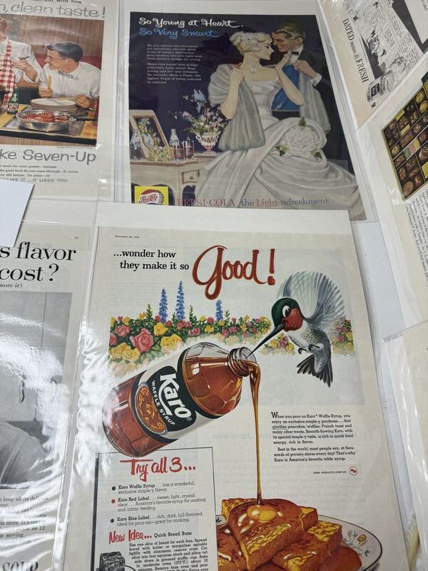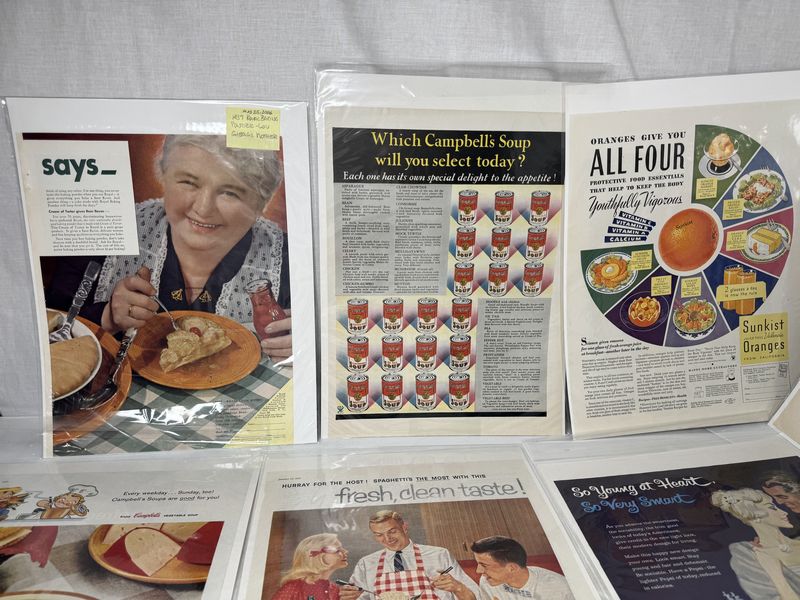 Magazine cut outs, 12 total print ads food related in a plastic sleeve with cardboard backing. See photos for description sold as is.