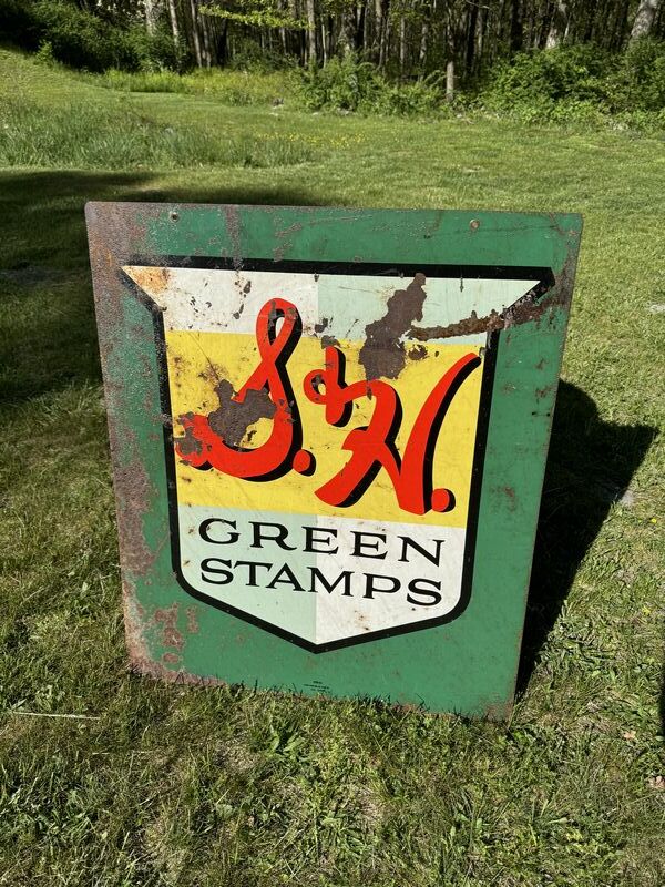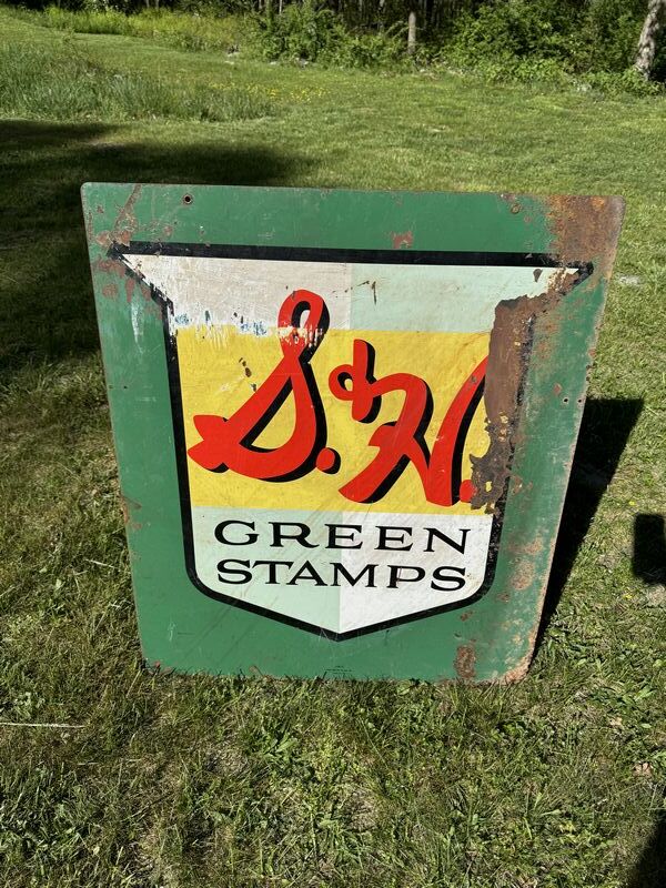 Green stamps double sided sign metal tin. With hanging bracket 30“ x 35“ see photos for description sold as is