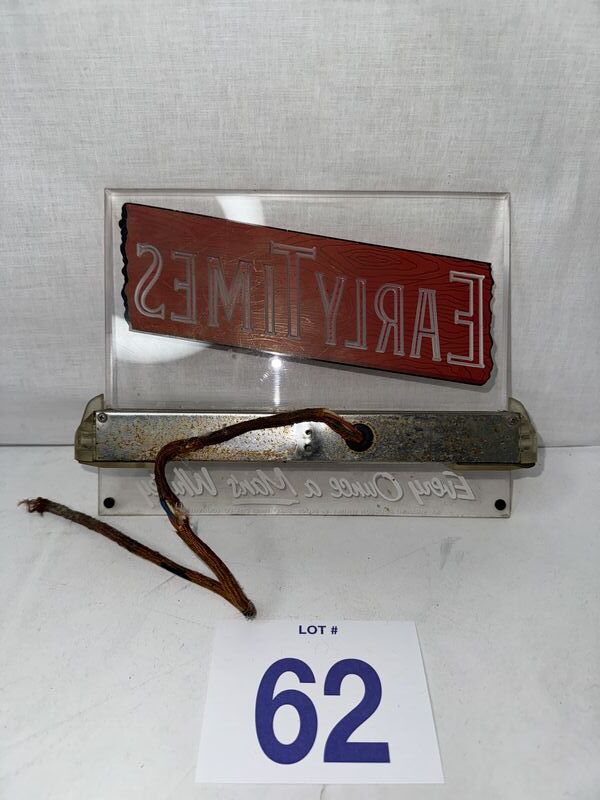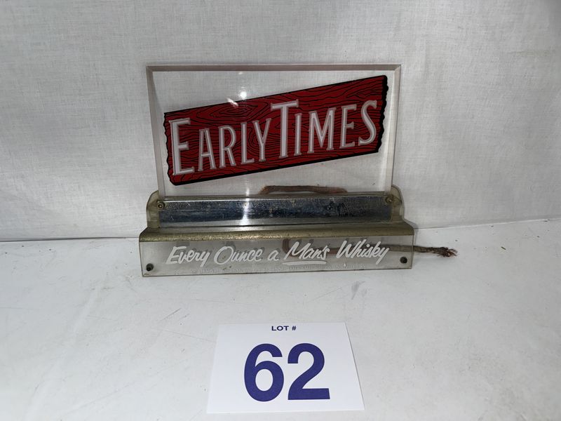 Early times whiskey lucite illuminating sign. sign is untested. Restoration recommended. 10 x 7” see photos for description sold as is.