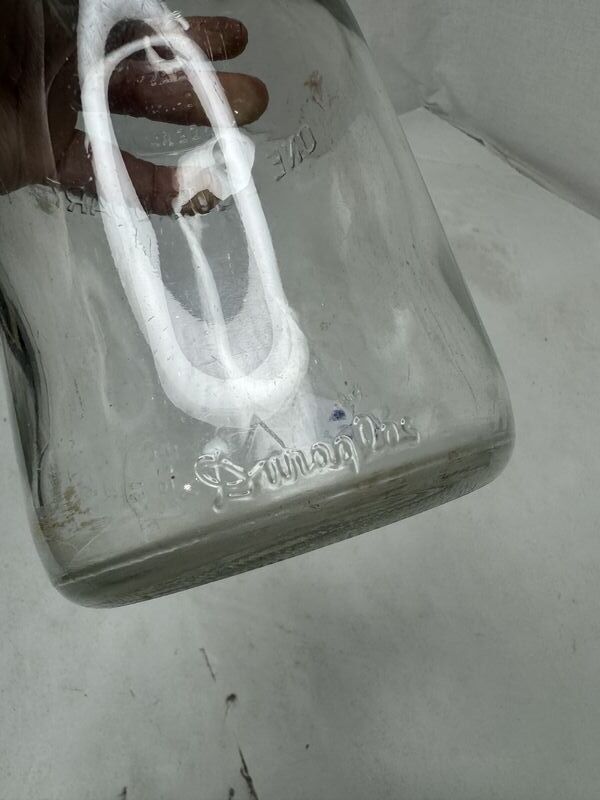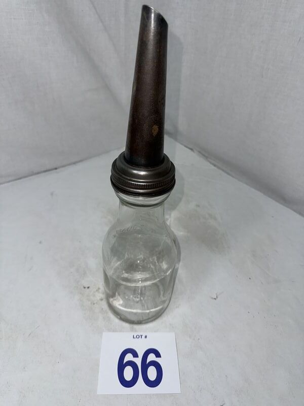 Douglas oil co. Glass oil bottle with spout. No chips or cracks. See photos for description sold as it.