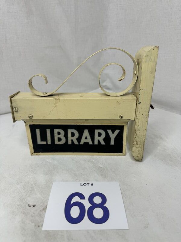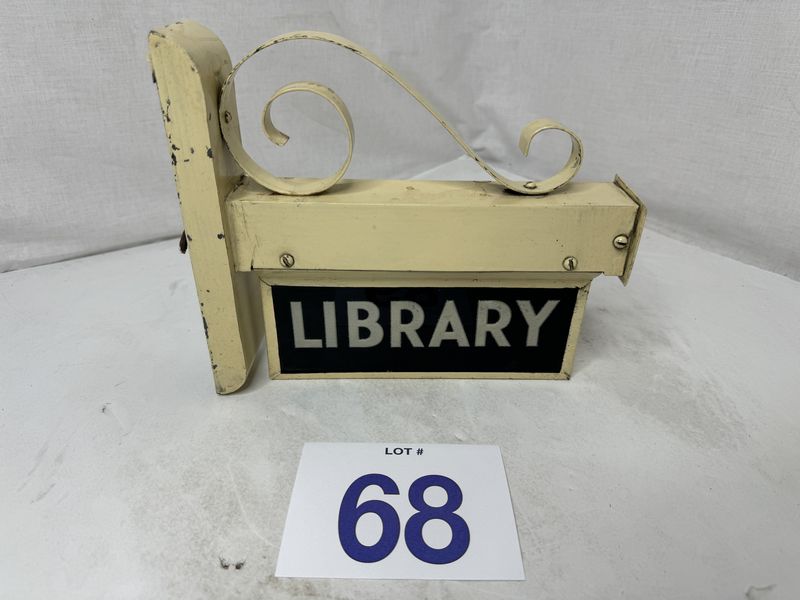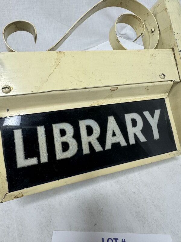 Antique handblown glass library light up double sided sign with bracket. Untested restoration recommended no chips or cracks in the glass 9” x 7” see photos for description sold as is.