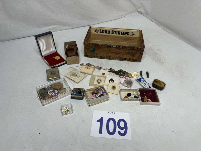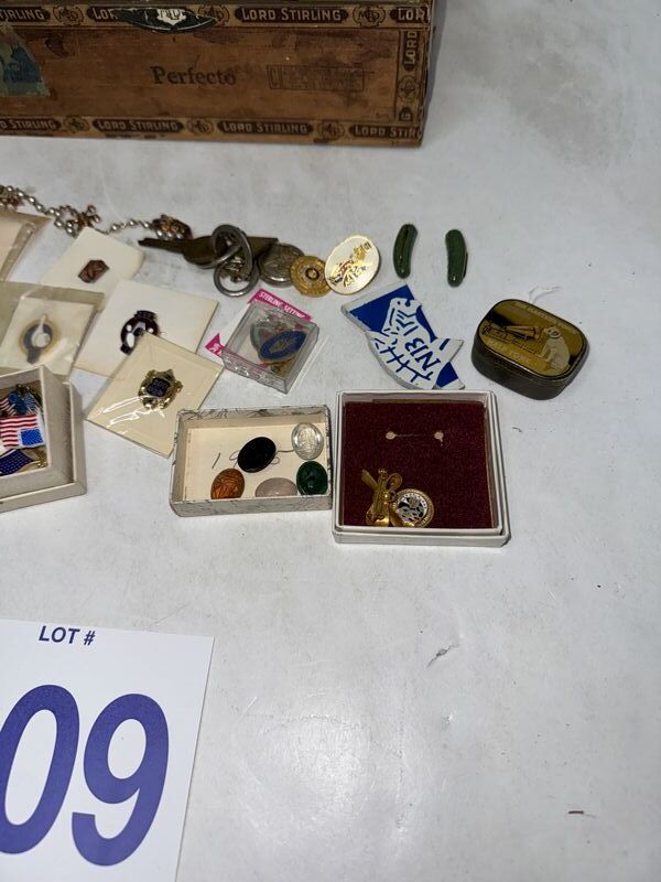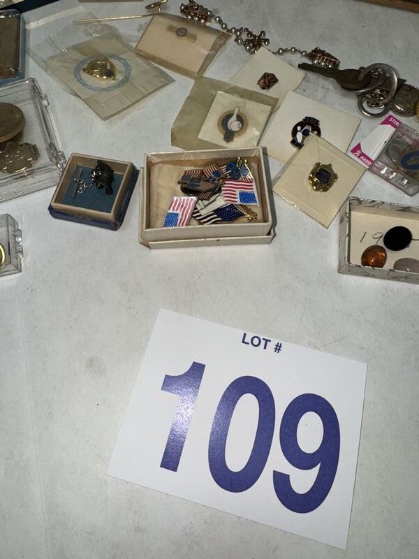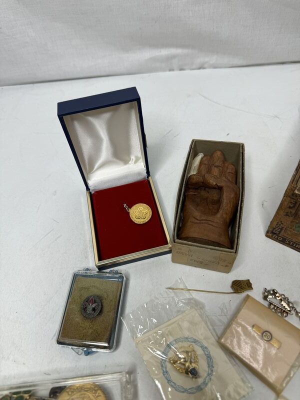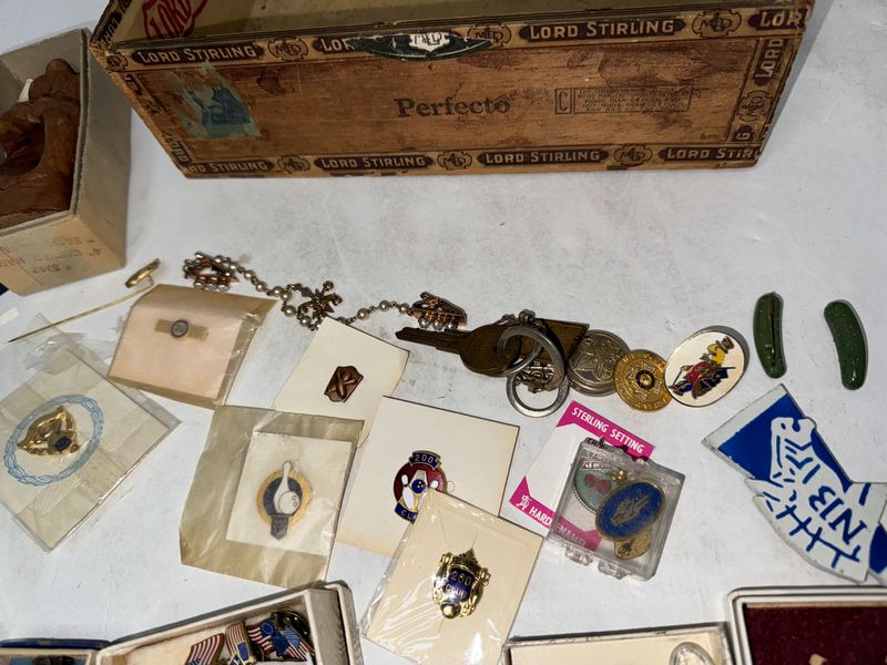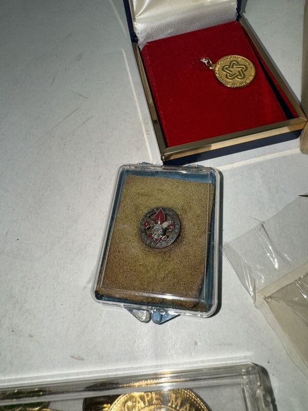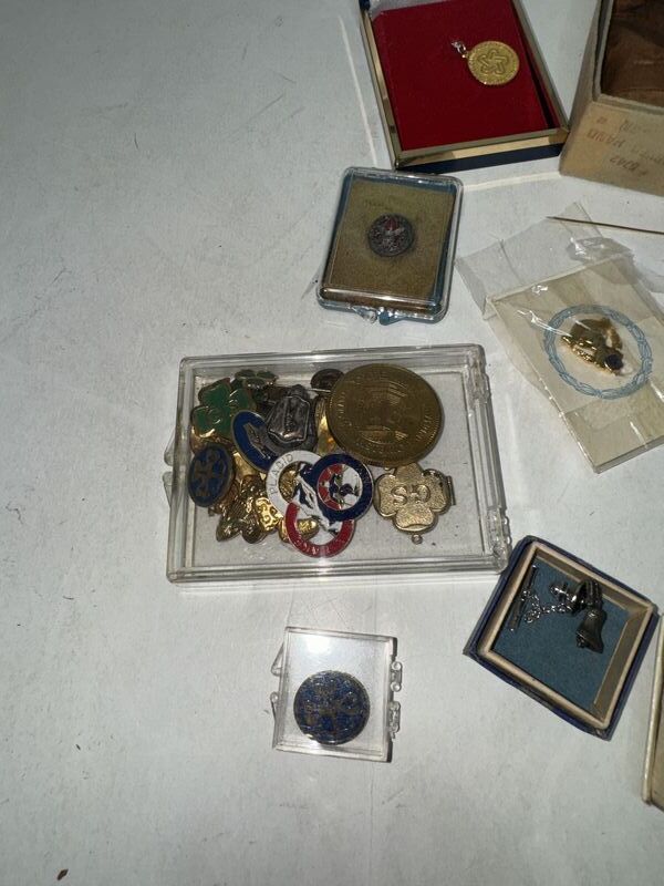 Various kinds of pin backs and badges there’s Boy Scouts and Girl Scout badges. There’s bowling pins and other different types of subject matter. See photos for description sold as is.