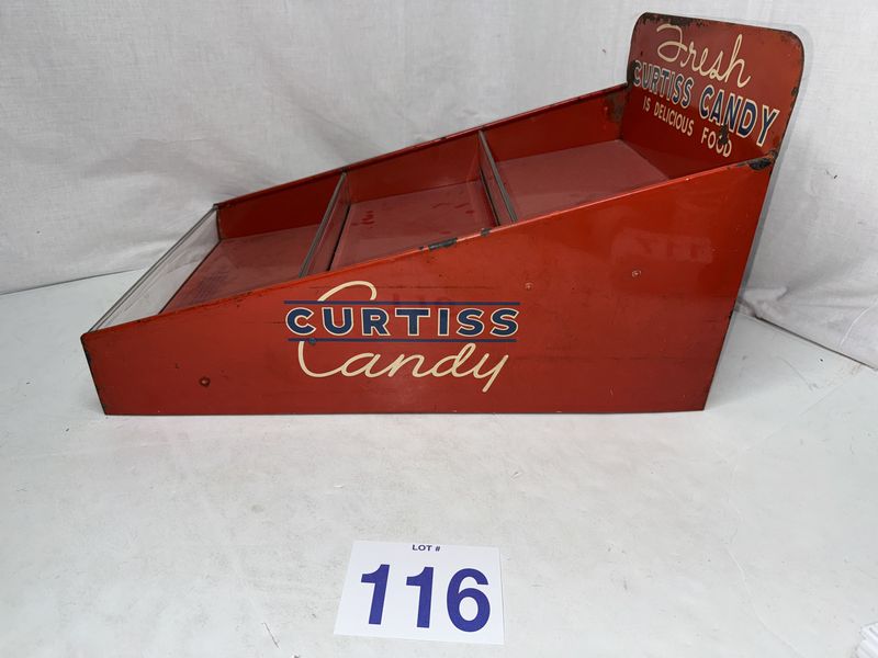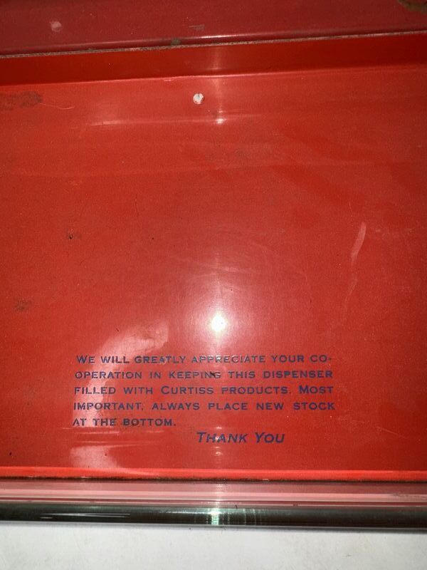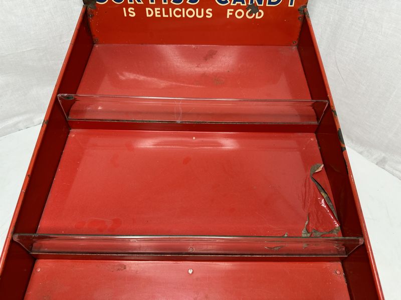 Curtiss Candy counter display, with original glass dividers. The glass dividers do have some chips on the corners. The display has paint peeling and some rust tarnish measurements are 24” x 15” how much is by 12 inches high. See photos for description sold as.