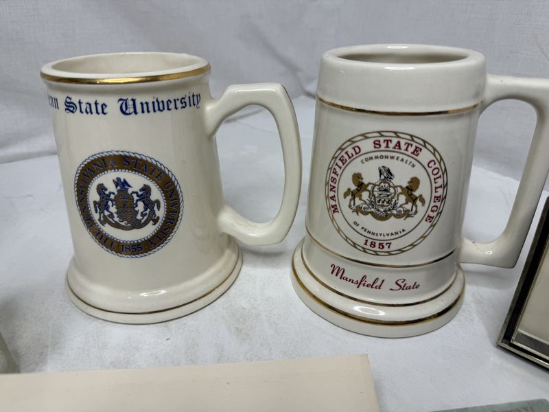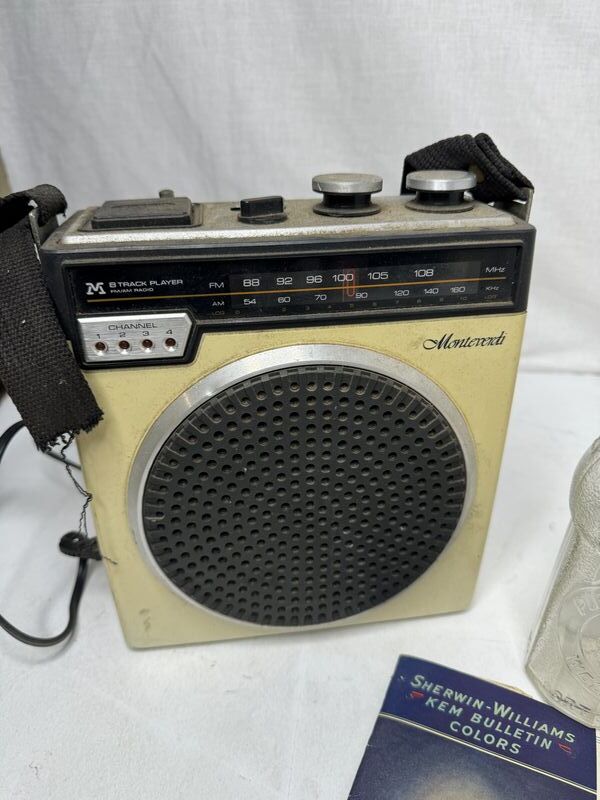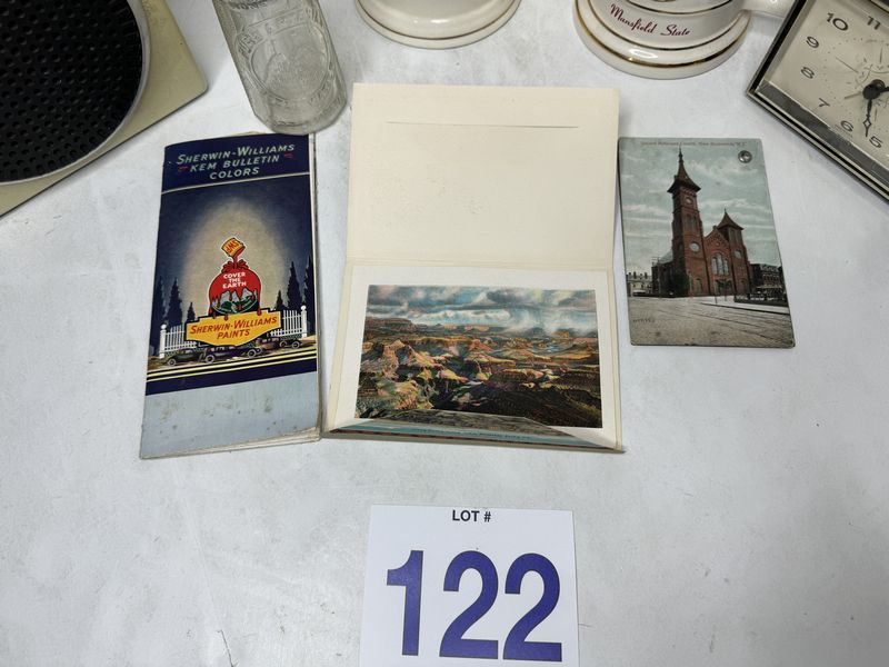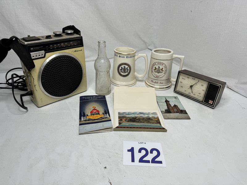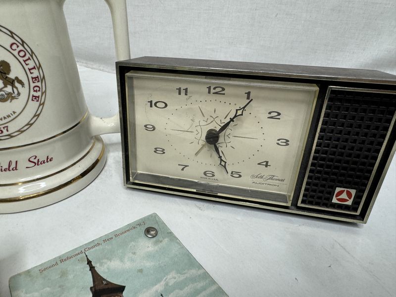 Vintage radio, twin mountain water bottle Port Jervis, New York , two college Steins one Seth, Thomas alarm, clock, Sherwin-Williams brochure, and postcards