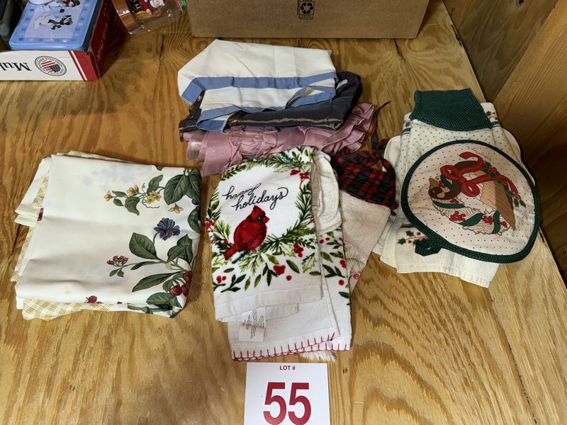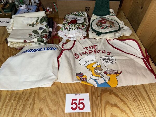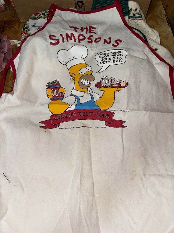 1990 Simpsons apron progressive apron, some various towels, and potholders and other types of decorations see photos sold as is