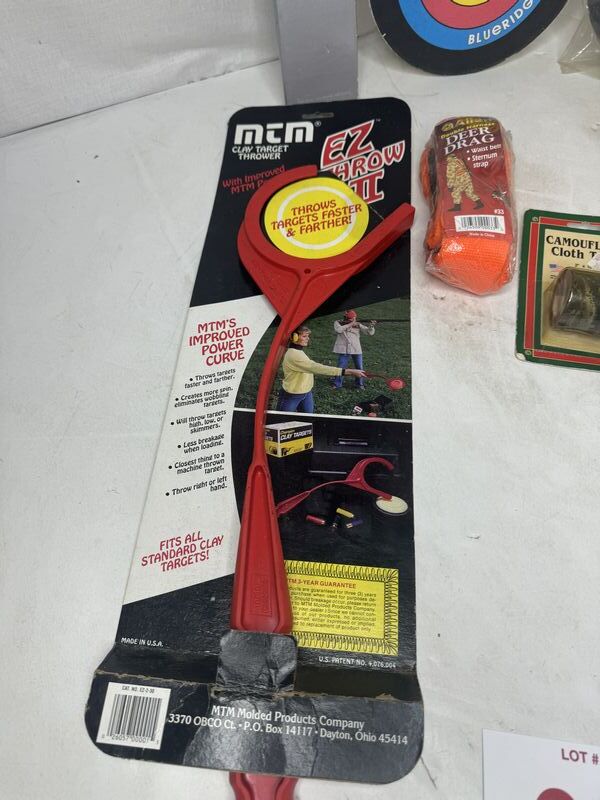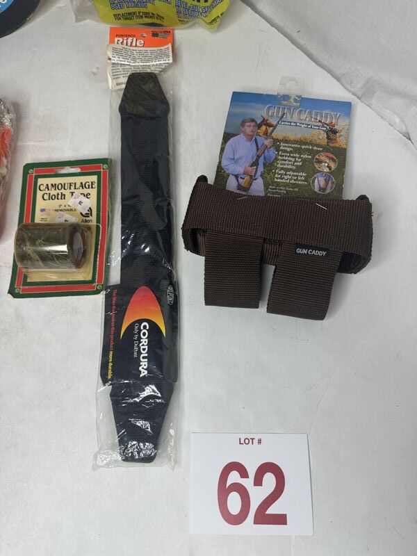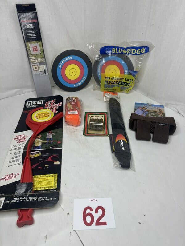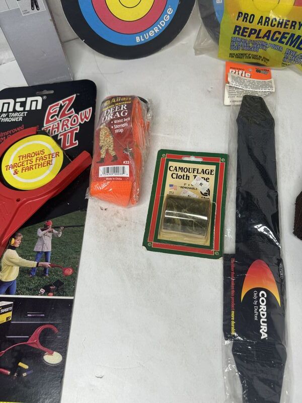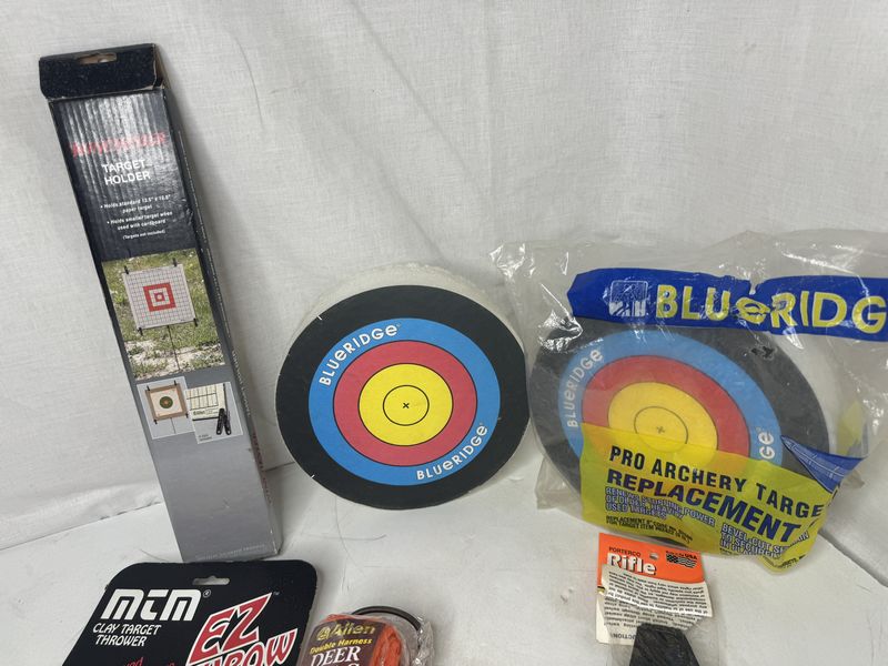 Two archery targets one Winchester target holder a roll of camouflage cloth, tape, dear drag strap, easy, throw clay pigeon, a rifle strap and a gun caddy. See photos for description sold as is.