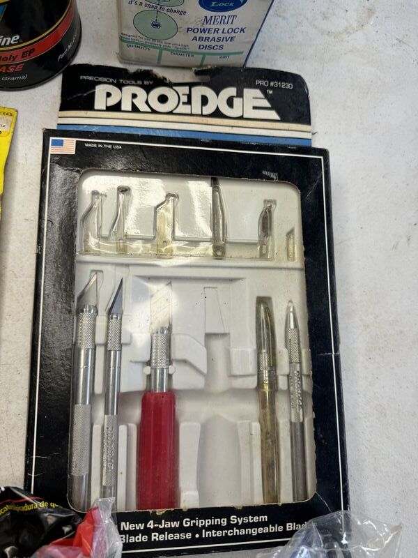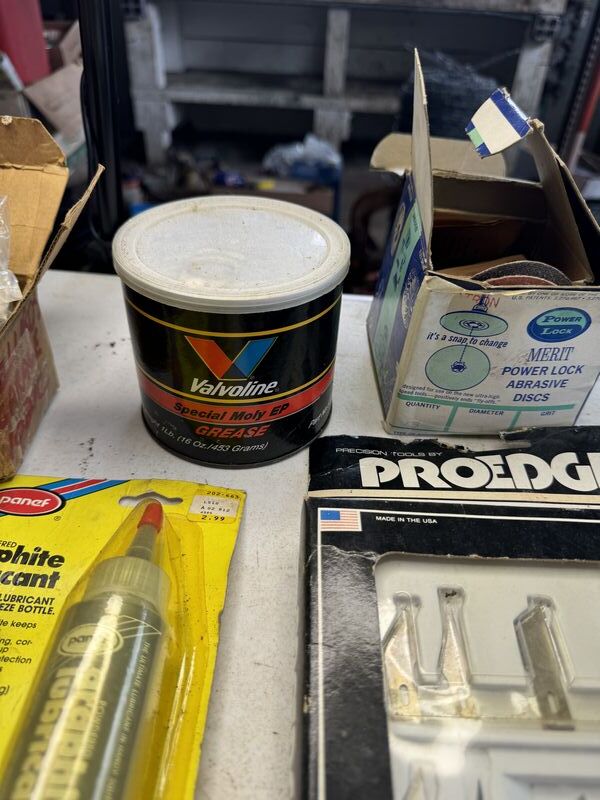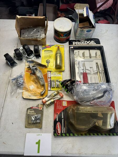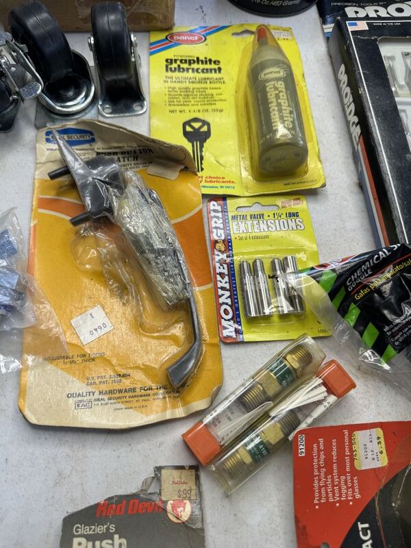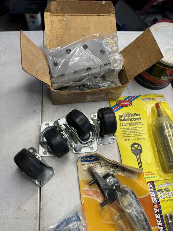 Caster wheels, new old stock, hinges, sanding, wheels, new old stock, Valvoline, grease graphite, lubricant door, handle valve, extenders, welding, fittings, safety goggles, and more see photos for description