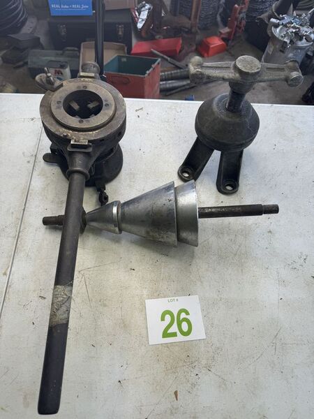 Snap on hub puller, vintage beaver, pipe, threader, and lathe tool accessories all in used condition. See photos for description.