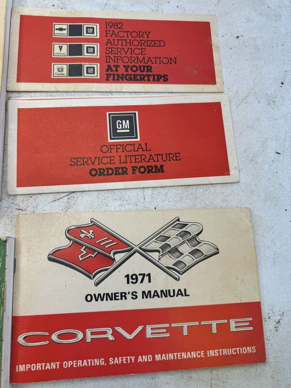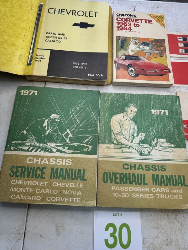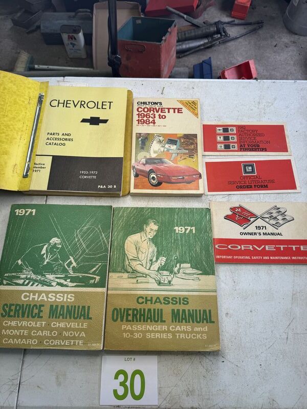 Chevy parts and accessory catalog 1953 to 1972, Corvette repair and tuneup guide 1963 to 1984, 1971 chassis service manuals and a 1971 owners manual see photos for description