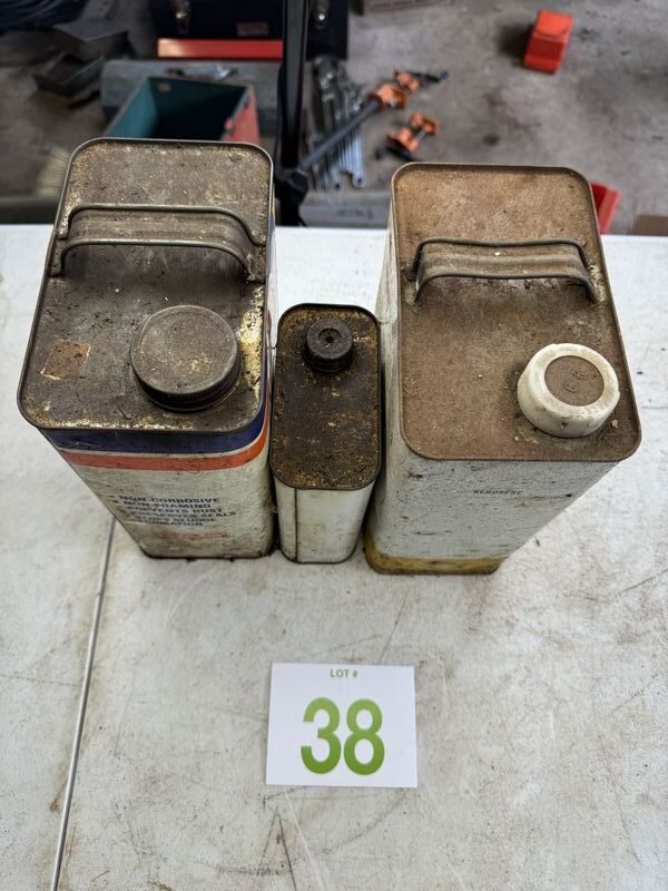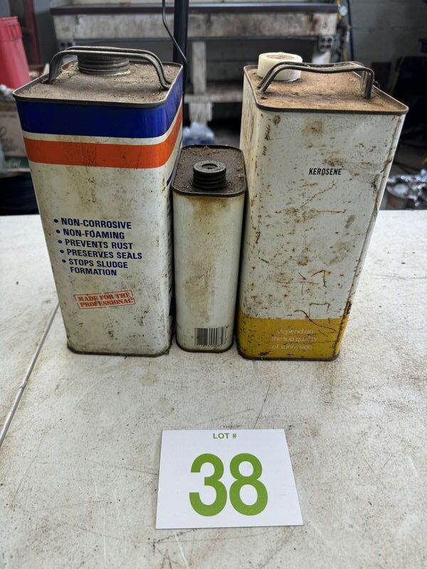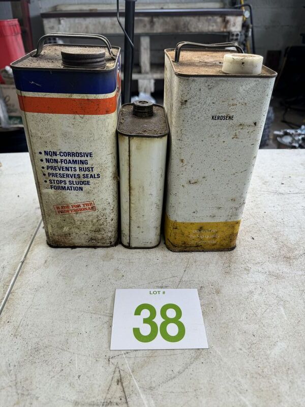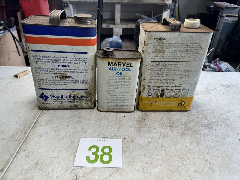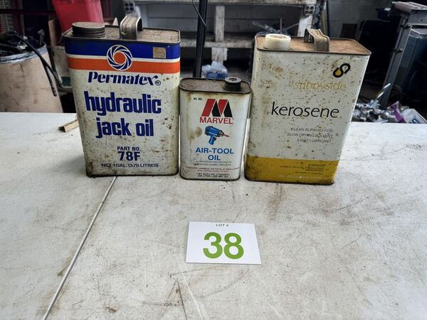 Permatex hydraulic jack oil, marvel, air, oil, and Sunnyside kerosene all oil cans have rust and tarnish. See photos for description sold as is.