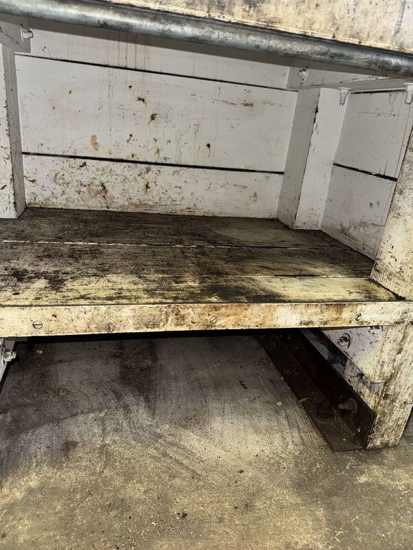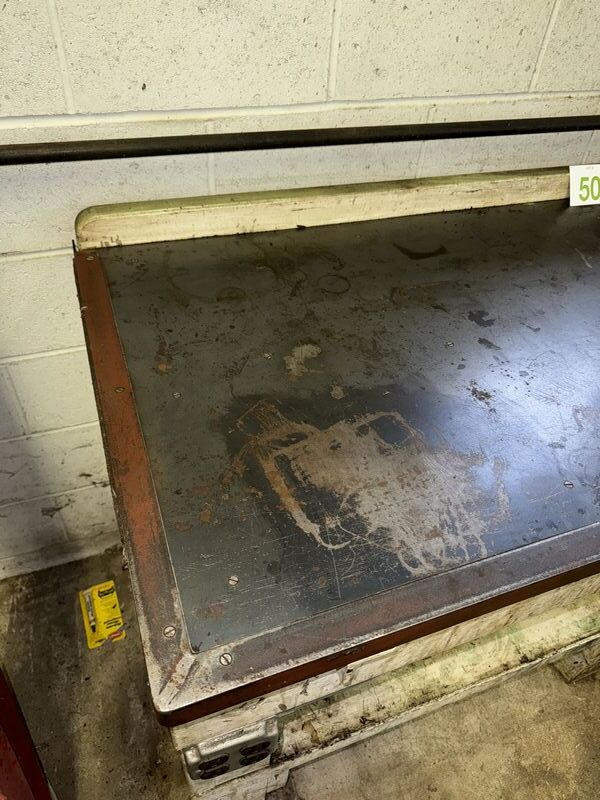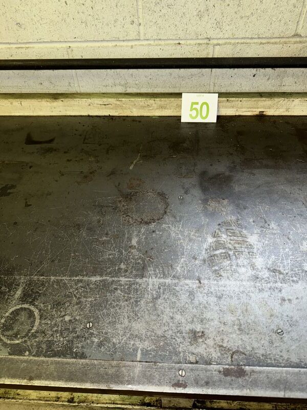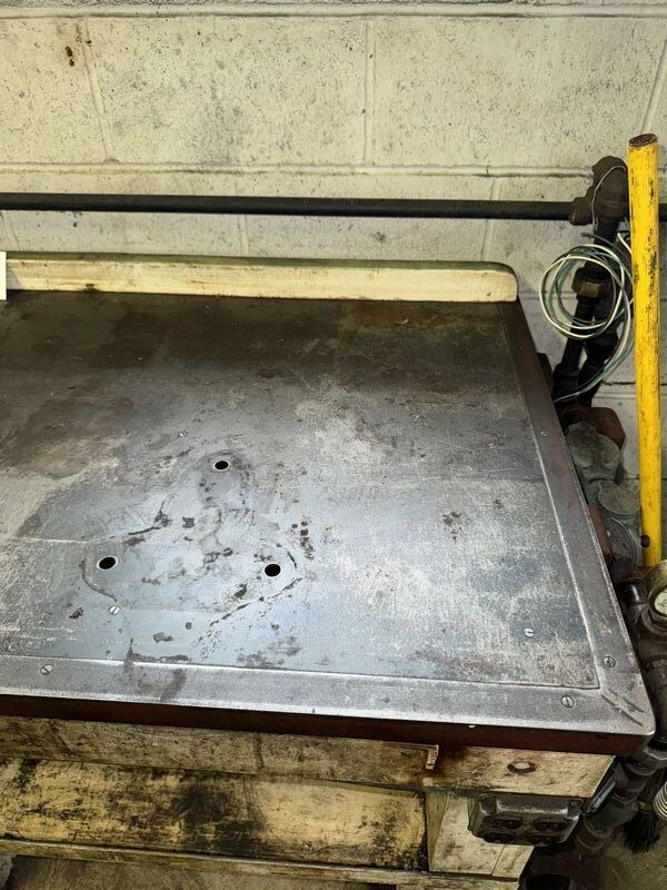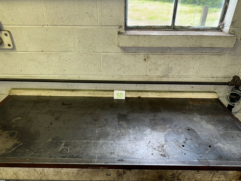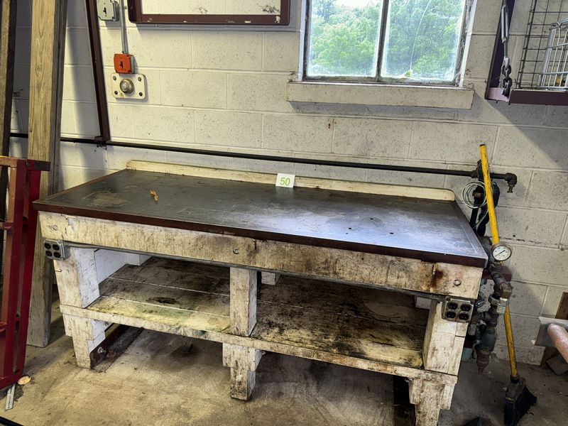 Heavy duty workbench with electric and air connected to it has a metal top. The dimensions are 78” x 31” x 40” in height see photos for description sold as is.