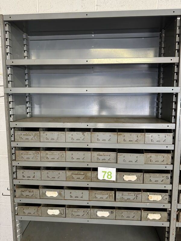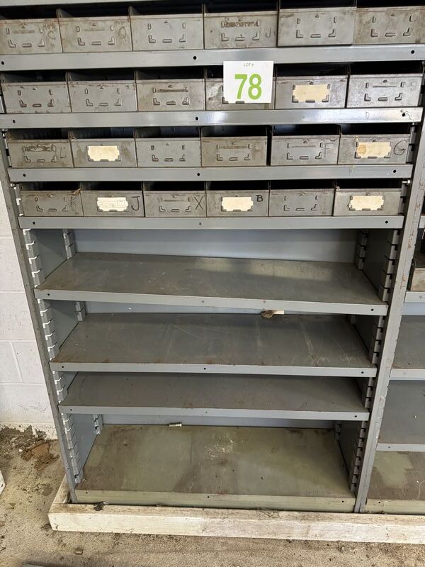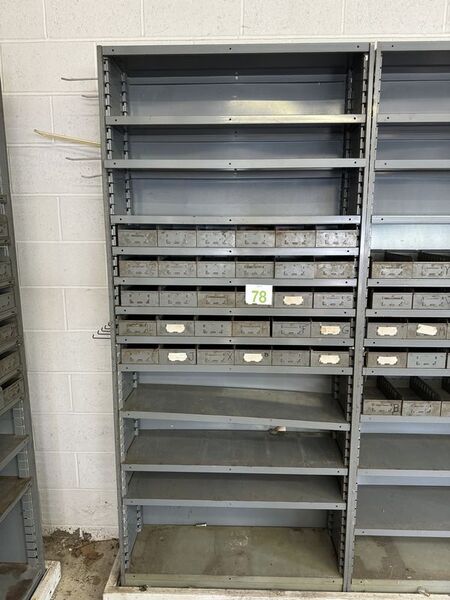Metal shelf unit in used condition dimensions are 7’ x 3’ x 1’ deep fires responsible for removal sold as is