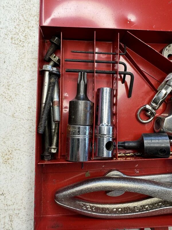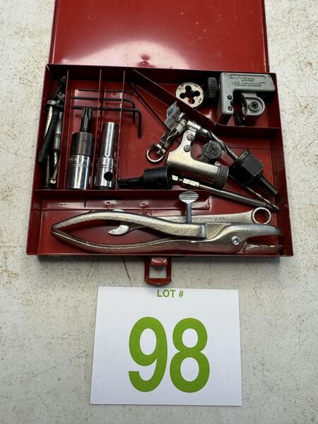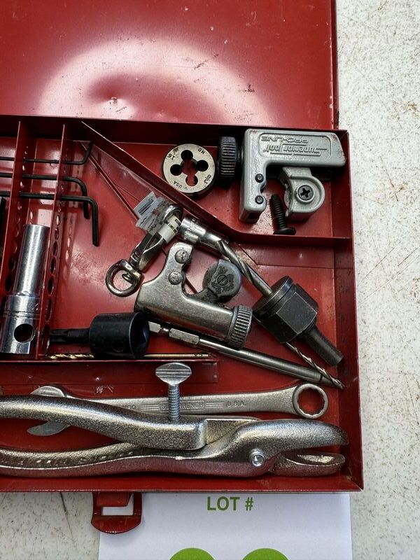 Put together tool kit, random tools, couple sockets, wrench, pipe, cutters, die see photos sold, as is
