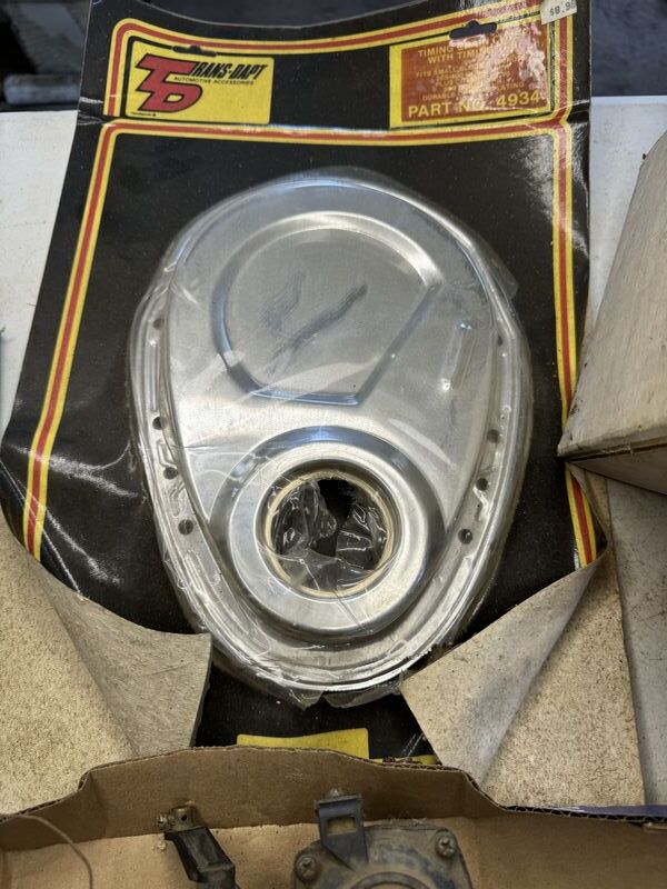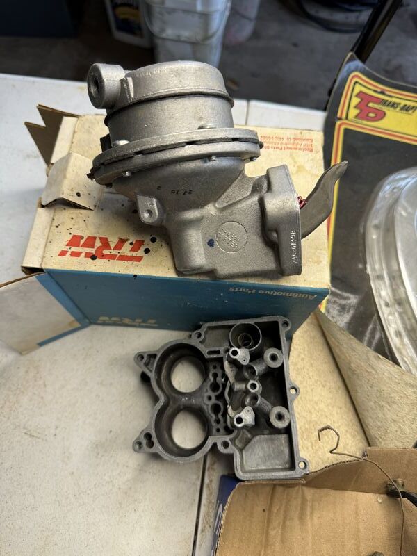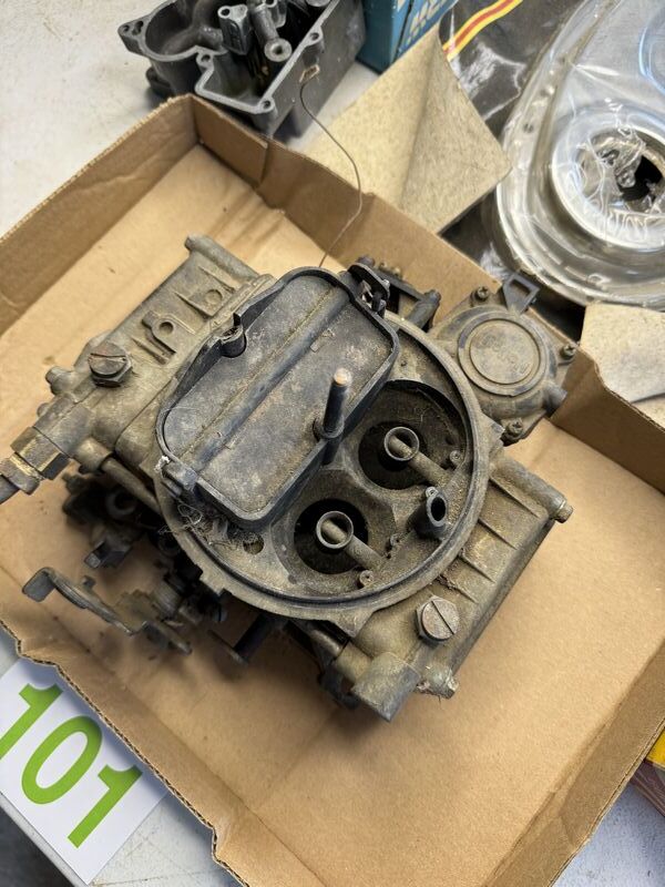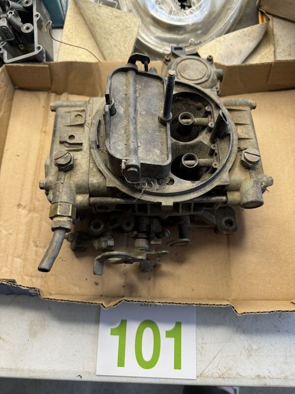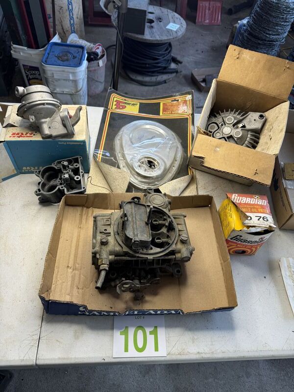 Holley carburetor and other various car parts and alternator a fuel pump timing chain cover, and an oil filter. See photos sold as is.