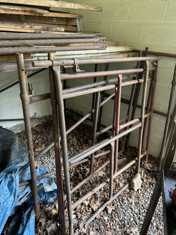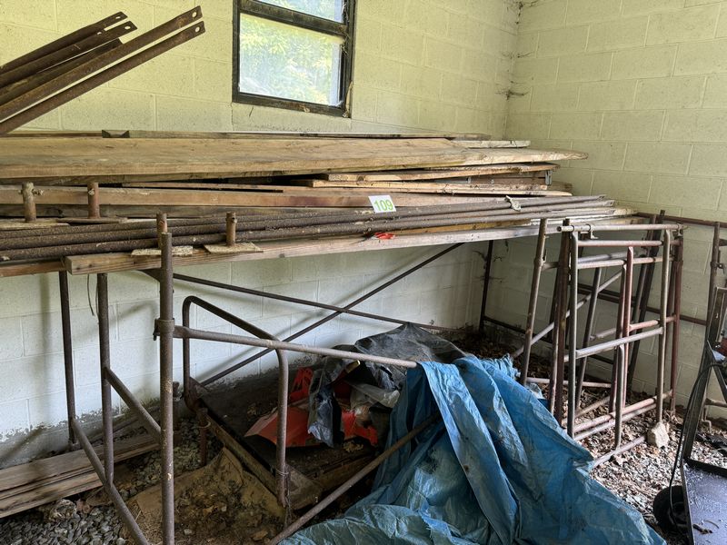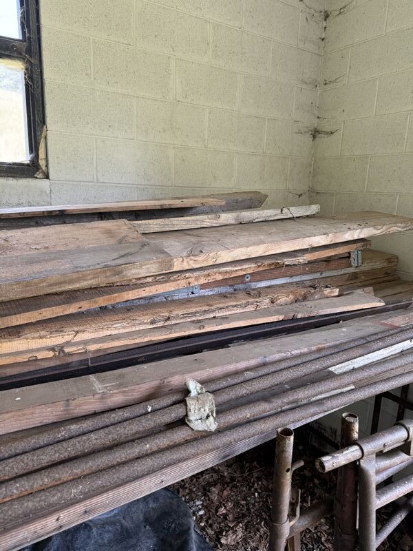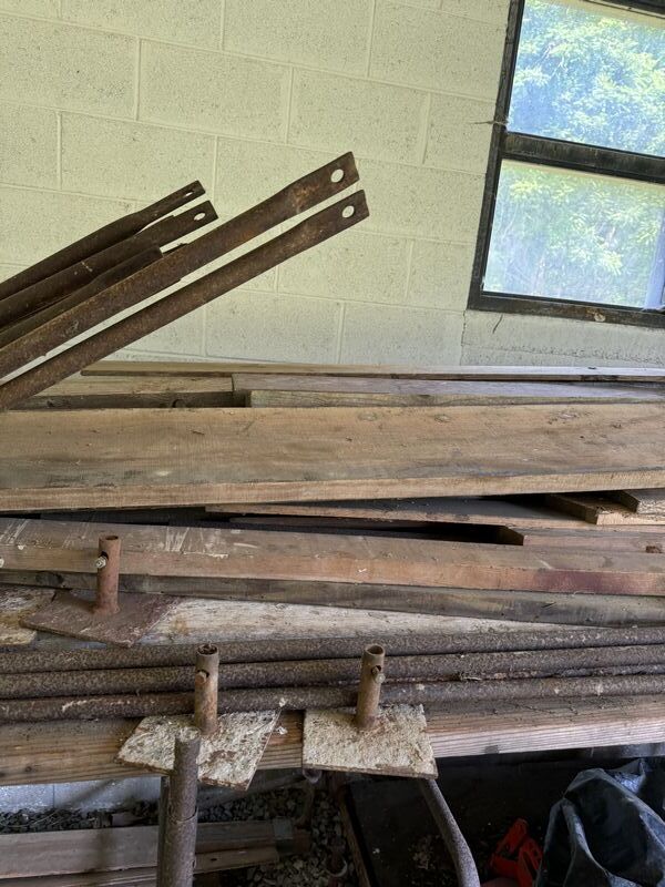 Scaffolding pieces and crossmembers and pieces of plank board and lumber. Various types of wood. Various lengths sold as is.