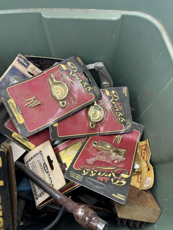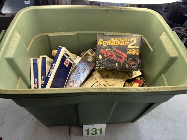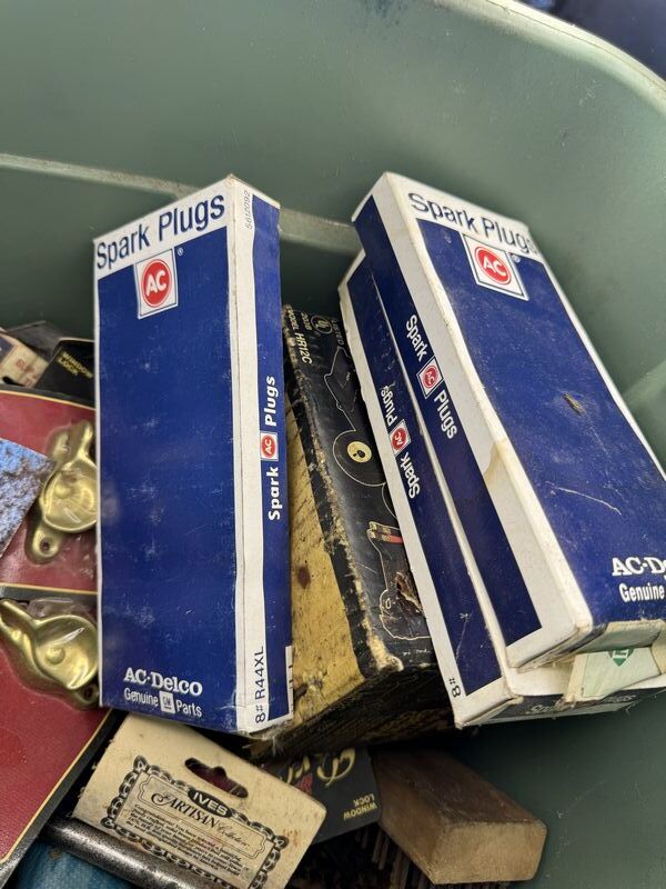 New old stock battery charger, gauges, trowel spark plugs wrenches sandpaper door hardware see photos sold as is