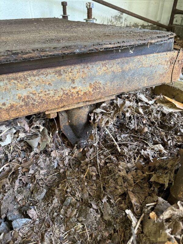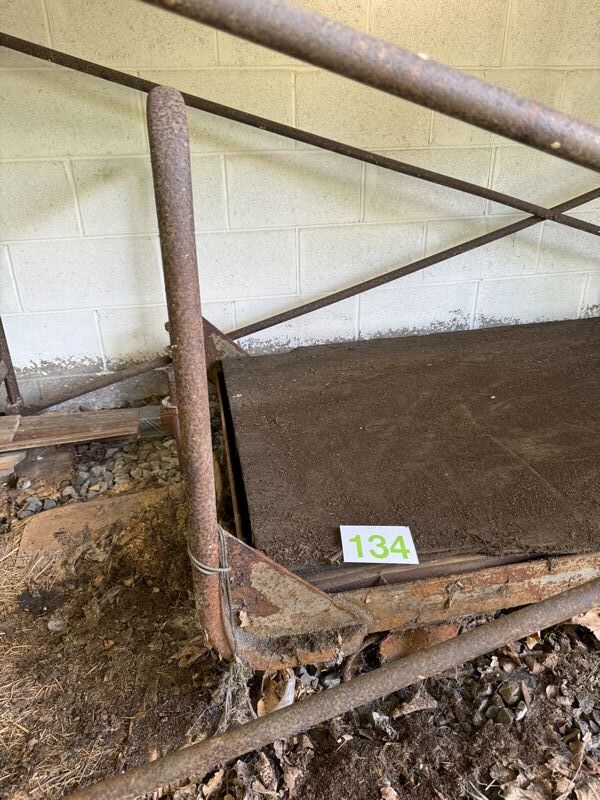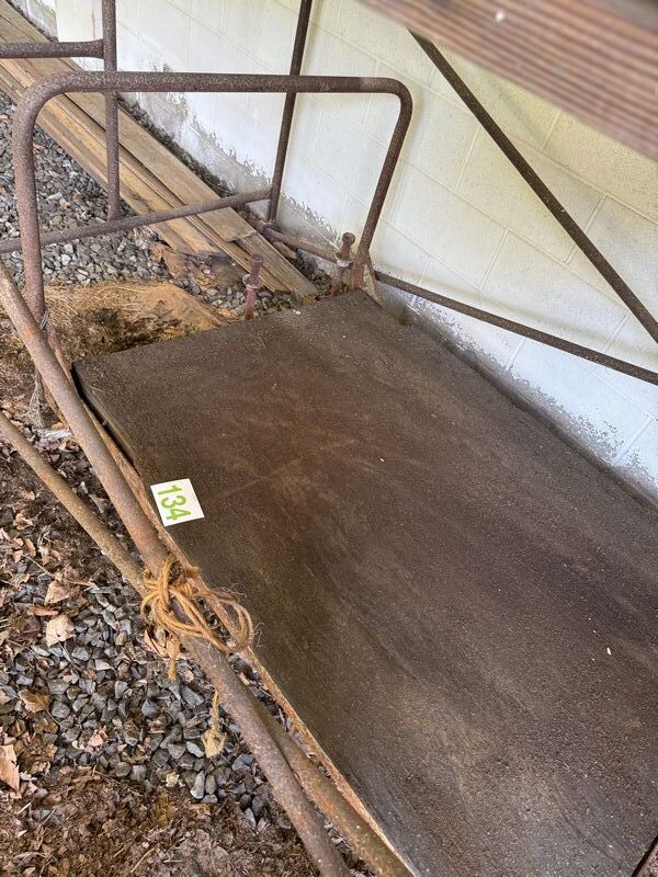 Industrial pushcart has metal caster wheels. The dimensions are 3’ x 5’ needs restoration sold as is
