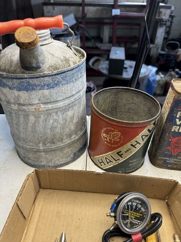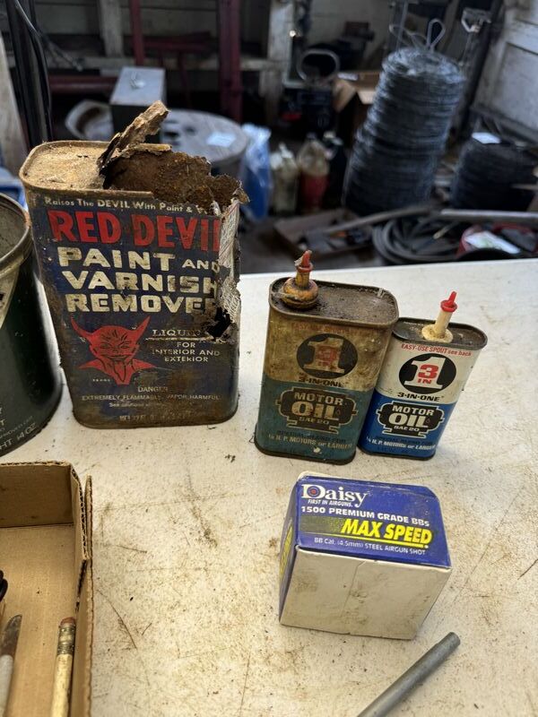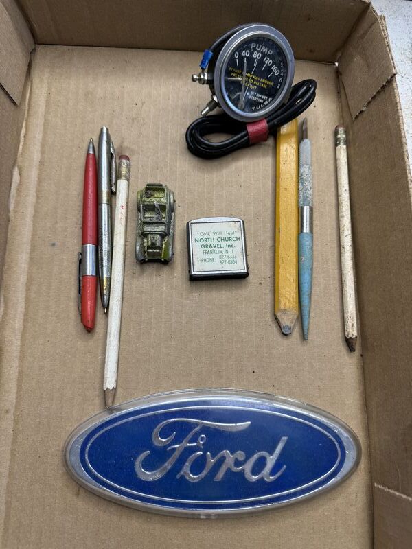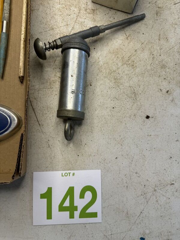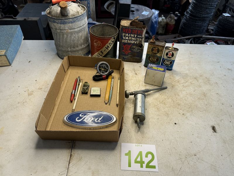 Various types of oil cans, a pump gauge advertising tape measure Ford emblem grease gun, new old stock, daisy BBs, and some pens and pencils one Lesney car see photos sold as as