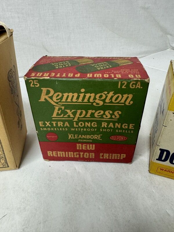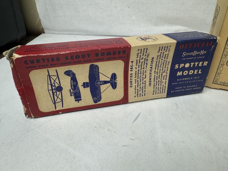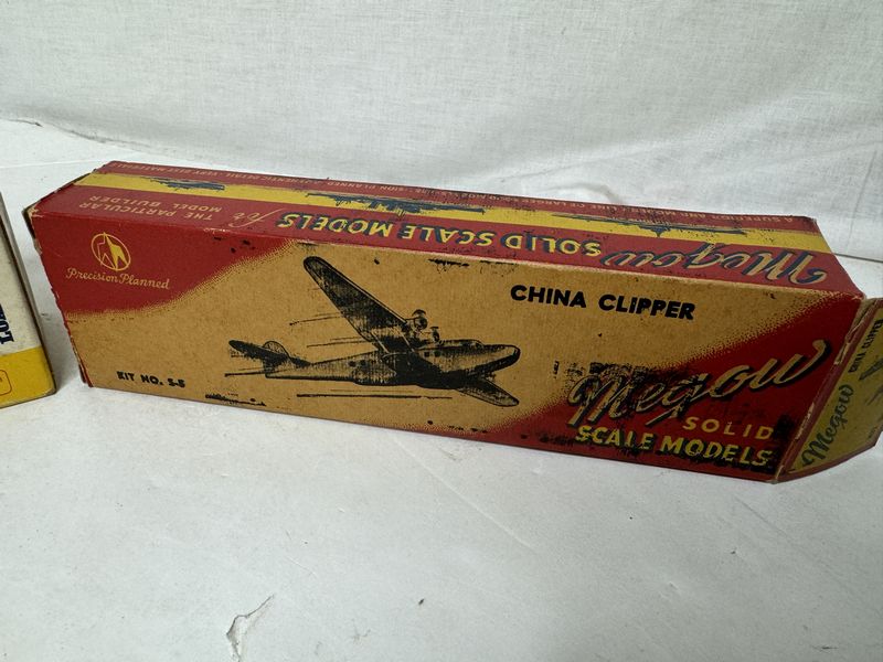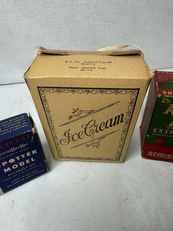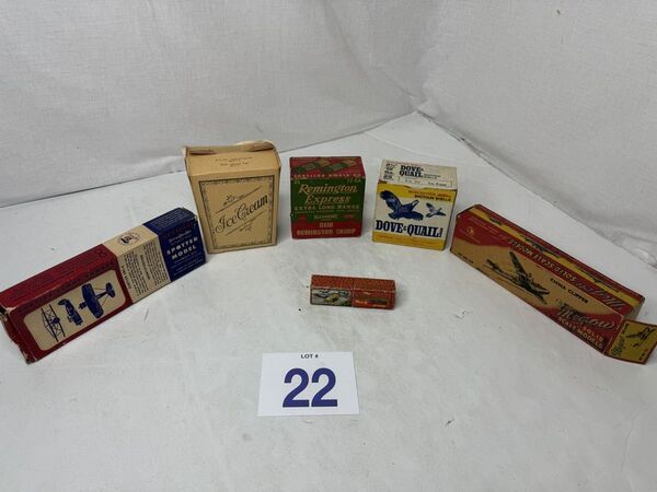 Boxes only for advertising no contents, there’s curtis Scout bomber box, old ice cream container, Remington express bullet box, dove and quail bullet box, and Megow scale models box, see photos sold as