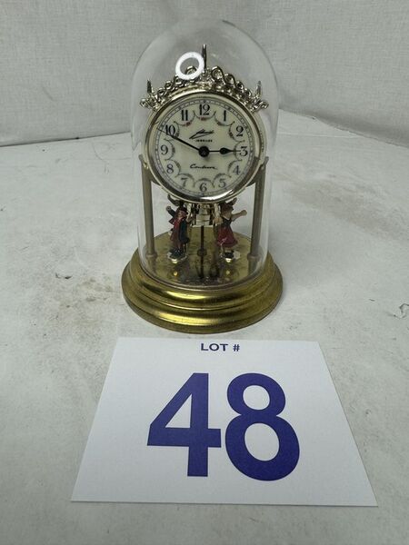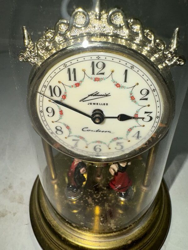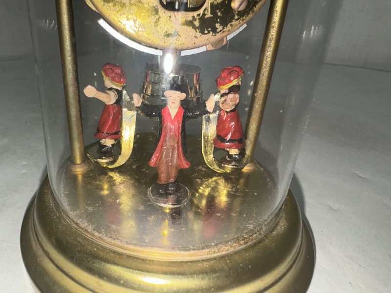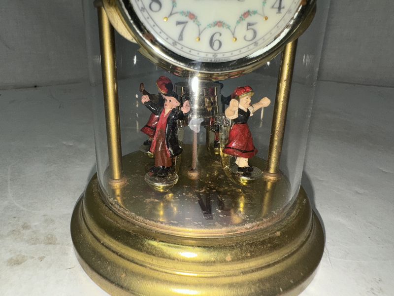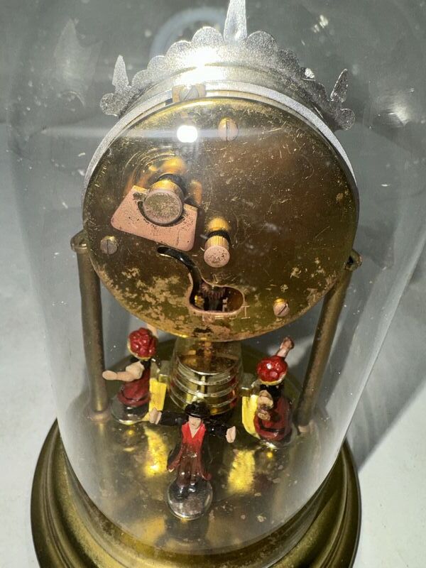 Miniature pendulum dancers clock approximately 6 1/2 inches tall untested see photos for description