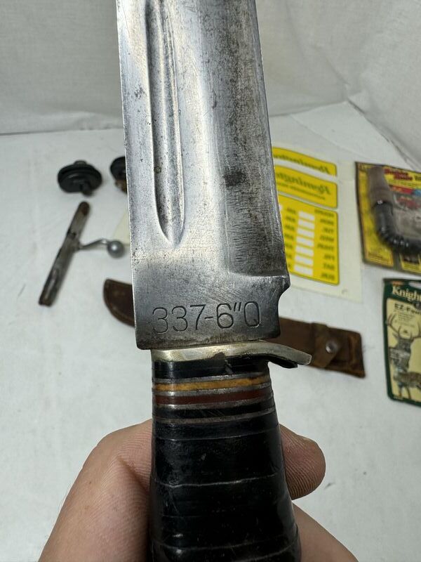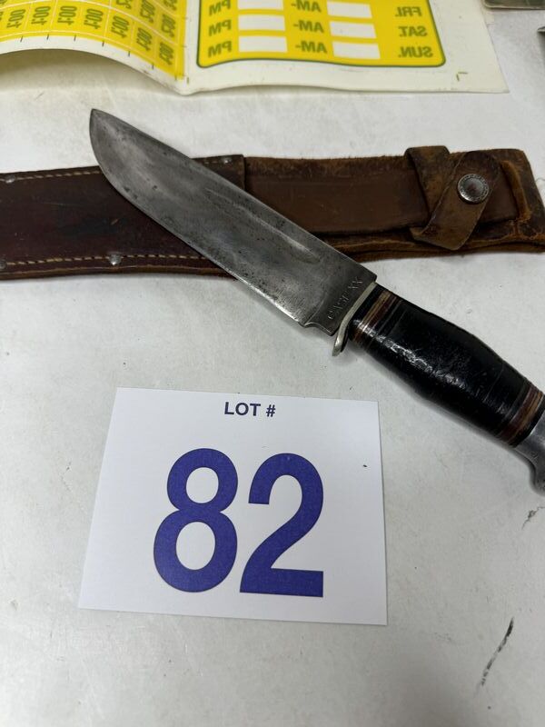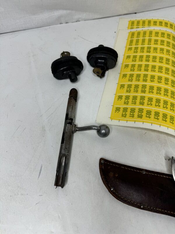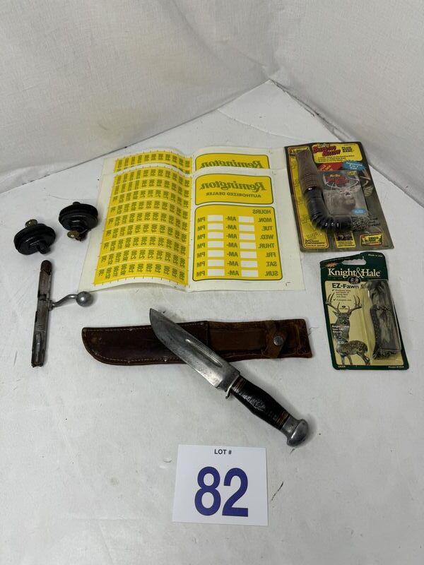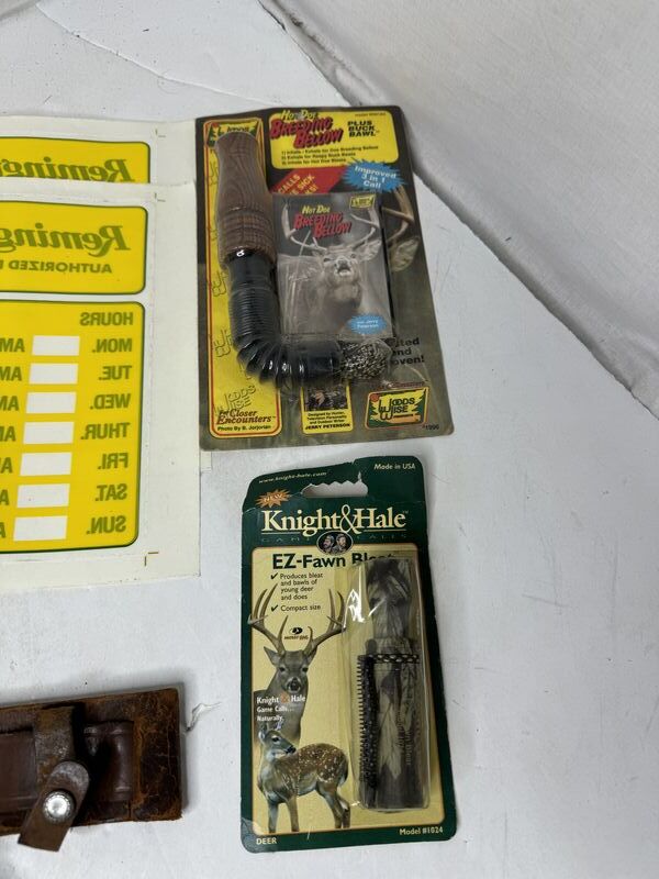 Case knife, rifle bolt, trigger locks, game calls, and vintage Remington store hours stickers